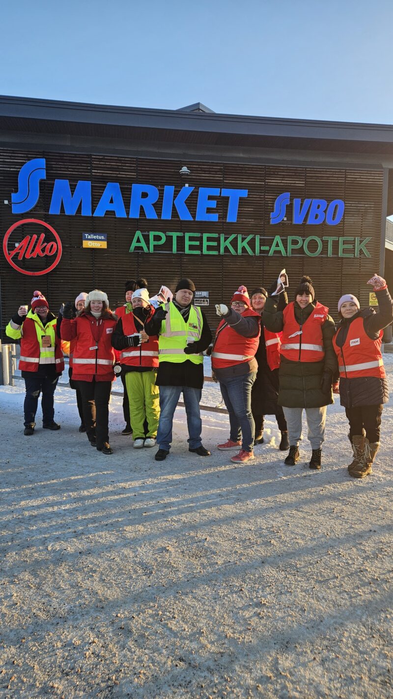 Etusivu » Ajankohtaista » Uutishuone » Kaupan myymälöiden lakko käynnistyi – ”Yhdellä palkalla pitäisi tulla toimeen” Uutiset 19.02.2025 10:46 Kaupan myymälöiden lakko käynnistyi – ”Yhdellä palkalla pitäisi tulla toimeen” Kaupan alan myymälöitä koskeva lakko käynnistyi tänään. Työntekijöiden palkkaukseen tarvitaan parannusta, Prisma Itäkeskuksen lakkovahdit totesivat. Juha Soralahti ja Outi Mertala toivovat tuntuvia palkankorotuksia kaupan alalle. PAM vauhdittaa kaupan alan työehtosopimusneuvotteluja lakoilla, jotka ovat parasta aikaa käynnissä. Kaupan logistiikkaa koskeva lakko alkoi maanantaina, ja tänään käynnistyi ruokakauppojen myymälöitä koskeva lakko. Helsingissä herättiin kipakkaan pakkasaamuun. Siitä huolimatta Itäkeskuksen Prisman edustalle kerääntyi suuri joukko lakkovahteja heti aamusta. Paikalla oli Outi Mertala, Prisma Itäkeskuksen toimipaikkakohtainen luottamusmies. − Olen lakossa, koska yhdellä palkalla pitäisi tulla toimeen. Parannuksia tarvitaan myös työhyvinvointiin ja työssäjaksamiseen, hän sanoo. Lakkovahdit jututtivat paikalle tulleita ihmisiä ja saivat tukea kaupan alan työntekijöiden vaatimuksiin useaan otteeseen. S-Market Sokos Helsingin ruokatorin vastaava Juha Soralahti muistuttaa, että lakon tarkoituksena on paikata hintojen nousun aiheuttamaa ostovoimakuoppaa. − En ole lakossa työnantajia vastaan, vaan solidaarisuuden vuoksi kaikille työntekijöille matalapalkka-alalla. Ostovoima vs. inflaatio. Kumpi painaa enemmän? Ostovoima, hän sanoo. Itäkeskuksen Prisman lakkovahdit kokoontuivat kaupan edustalle heti aamusta. Työntekijät ovat osallistuneet kaupan myymälöiden lakkoon laajasti ympäri Suomen. Katso kuvat eri puolilta Suomea: Citymarket, Kemi. Prisma Lielahti, Tampere Citymarket Puuvilla, Pori. Lidl, Kuusamo. S-Market, Porvoo. ABC, Juva. Citymarket, Kupittaa. Citymarket, Kuopio. Prisma, Kouvola. Citymarket Mikkolan Icco, Pori. Citymarket, Imatra. Seppälän Prisma, Jyväskylä. Citymarket, Savonlinna. Keskon alueterminaali, Oulu. Tokmanni, Kemi. Iso Omena, Espoo. Citymarket, Kauhajoki. Citymarket, Lahti. Lidl, Raahe. Avainsanat: kaupan ala työehtosopimusneuvottelut työtaistelu Mitä pidit tästä sisällöstä? PhoneKenttä on validointitarkoituksiin ja tulee jättää koskemattomaksi.Reaktio(Pakollinen) Tämä oli hyödyllinen Pidin kovasti tästä sisällöstä En ymmärtänyt Ei ollut hyödyllinen Kommentti (valinnainen)CAPTCHA Jaa Lue seuraavaksi Artikkelit jäsenyys työehtosopimusneuvottelut työtaistelu PAM puolustaa jäseniään nyt ja tulevaisuudessa – jälkikäteen saatu oikeutta ja korvauksia alkuvuoden lakkoihin liittyen 11.12.2025 Artikkelit jäsenyys kaupan ala luottamushenkilö työturvallisuus ”Nuorille ei saa opettaa, että häirintä olisi osa työtä” 9.12.2025 Uutiset jäsenyys kaupan ala työsuhde työttömyys Yli 50 R-kioskia lopettaa – liiton tuen merkitys korostuu muutoksessa 8.12.2025 Näytä kaikki