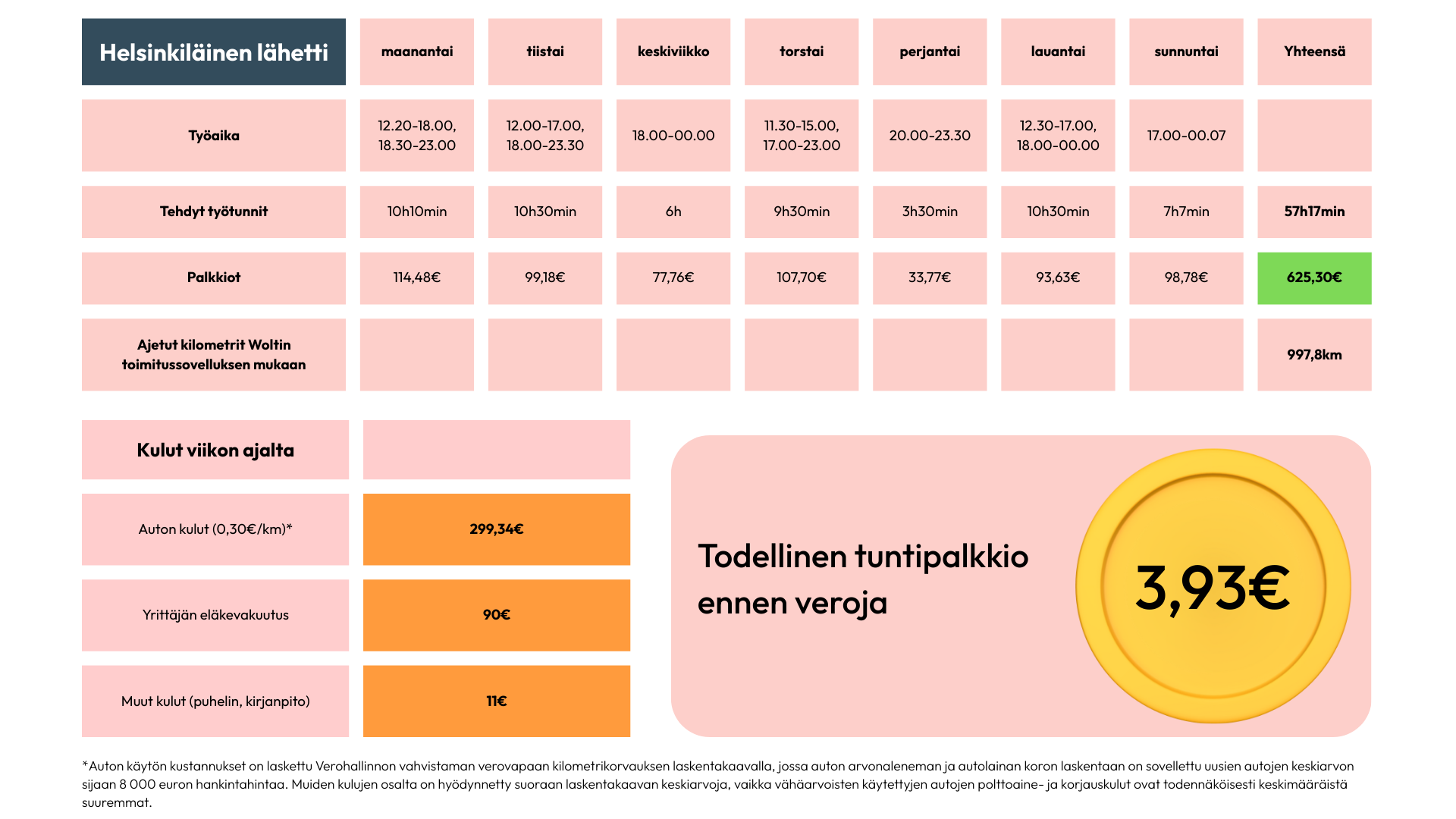 Etusivu » Ajankohtaista » Uutishuone » Alle neljä euroa tunnissa – PAM selvitti ruokalähettien todelliset tuntipalkkiot Artikkelit 05.02.2026 10:00 Alle neljä euroa tunnissa – PAM selvitti ruokalähettien todelliset tuntipalkkiot Lähes 60-tuntista työviikkoa tekevälle lähetille voi jäädä kulujen jälkeen alle neljä euroa tunnilta ennen veroja. Kolme ruokalähettiä piti viikon ajan kirjaa työtunneistaan, ajetuista kilometreistä ja palkkioistaan. Tulokset paljastavat lähettien todellisten tuntiansioiden olevan erittäin pienet. – Tämä on absurdia hyvinvointivaltiossa. Olemme kuin muurahaisia kadulla. Kollegoideni silmistä näen, että he voisivat itkeä. Niin karu todellisuus on. Bangladeshista Vaasaan opiskeluiden perässä vuonna 2018 muuttanut mies on toiminut Woltin lähettinä Turussa yli viiden vuoden ajan. Hän on suorittanut kandidaatin tutkinnon kansainvälisestä liiketaloudesta. Turkulainen lähetti ja kaksi muuta Woltin lähettiä eri puolilta Suomea pitivät viikon ajan kirjaa työtunneistaan, ajetuista kilometreistä sekä palkkioistaan tammikuussa 2026. PAM on nähnyt lähettien käyttämän Woltin sovelluksen kuvakaappaukset maksetuista palkkioista ja kertyneistä ajokilometreistä. Haastateltavat eivät esiinny jutussa omilla nimillään, sillä he pelkäävät mahdollisia seurauksia toimeksiantajaltaan Woltilta. Läheteillä ei ole minkäänlaista irtisanomissuojaa. Kaikkien haastateltavien henkilöllisyys on PAMin tiedossa. Helsinkiläinen lähetti, tammikuu 2026 Lähetin todellinen tuntipalkkio ennen veroja jää muutamaan euroon Wolt ei itse kerro lähettiensä tuntipalkkioita. Yhtiö kertoo ”aktiiviajan keskimääräisen palkkion” olevan 20–21 euroa ”aktiivitunnilta”. Tätä viestiä on toistanut myös Woltin perustaja Miki Kuusi. Tähän lasketaan mukaan ainoastaan aika, jolloin kuljetuksia tehdään. Kuljetusten väliin jäävää aikaa Wolt ei laske mukaan esimerkkeihinsä. Tämän jutun esimerkeissä työajaksi on laskettu se aika, kun lähetti on aktiivisena ja valmiina vastaanottamaan tilauksia. Mikäli lähetti on pitänyt taukoa kesken päivän, sitä ei ole laskettu työajaksi. Turkulaisen lähetin mukaan aito tuntipalkkio kulujen jälkeen on todella pieni. – Wolt laskee esimerkkeihinsä vain ajan, kun olet hakemassa tai viemässä tilausta. Se on harhaanjohtavaa. Aito tuntipalkkio on kamala. Minulla ei ole mitään päätösvaltaa ja ”yrittäjänä” en voi päättää työni hintaa. Mitä yrittäjyyttä se on? Turkulaisen lähetin todellinen tuntipalkkio hänen seurantaviikoltaan jää neljään ja puoleen euroon tunnilta. Turkulainen lähetti, tammikuu 2026 Kuopiossa asuva lähetti muutti Suomeen vuonna 2008 ja on valmistunut Suomessa tietotekniikan maisteriksi. Wolt-lähettinä hän on toiminut lähes kahdeksan vuotta. – Aikaisemmin Wolt kohteli meitä kuin kumppaneita ja meillä oli esimerkiksi kuukausitapaamisia. Nykyisin teen pitkää päivää, sillä palkkioita on laskettu yksipuolisesti. Jotta saan laskut maksettua, minun pitää tienata palkkioina sata euroa päivässä. Jatkan ajamista siihen asti. Eilen ajoin kaksitoista tuntia, jotta sain 116 euroa ennen kuluja ja veroja, mies kertoo. Wolt on laskenut lähettien palkkioita rajusti viime vuosien aikana. Wolt voi laskea palkkioita yksipuolisesti ilman neuvotteluja, sillä yhtiö kohtelee lähettejään yrittäjinä. Kuluja on kuopiolaisen lähetin mukaan paljon. Eläkemaksuun menee 398 euroa kuukaudessa ja polttoaineeseen lähes sata euroa viikossa. Lisäksi maksettavana on vielä auton vakuutus, kirjanpito sekä työssä käytettävä puhelin. Vaikka auto olisi hankittu edullisesti, on ylläpito kallista kovan käytön takia. – Tänä vuonna minulla on mennyt jo melkein tuhat euroa auton korjaamiseen. Kuopiolainen lähetti, tammikuu 2026 ”Tämä ei ole vapautta” Helsinkiläinen lähetti on asunut Suomessa yli 10 vuotta. Alun perin hän on Itä-Afrikasta. Wolt-lähettinä hän on toiminut yli viisi vuotta. – Olen niin lannistunut. Välillä teen jopa yli 60-tuntista viikkoa. Ei tunnu hyvältä tehdä töitä 10–15 tuntia päivässä ja tulla kotiin tyhjin käsin. Wolt kehuu usein julkisuudessa, että yhtiön yrittäjämalli tuo läheteille vapautta. Kokevatko lähetit, että heillä on Woltin lähettikumppaneina aito vapaus? – Ei, ei, ei, ei missään nimessä. Voin valita milloin aloitan työn, mutta en voi valita, kuinka paljon tulen ansaitsemaan. Tämä on manipuloitua vapautta, turkulainen lähetti sanoo. – Katsokaa kumppanuuden ja yrittäjyyden määritelmää. Tämä ei ole aitoa yrittäjyyttä, meillä ei ole mitään sananvaltaa. Tilannetta ei pidä kaunistella – tämä on nykypäivän orjuutta. En ymmärrä, miksi Suomen hallitus sallii tämän. Ei ole mitään tekosyytä antaa käyttää ihmisiä hyväkseen Woltin tavoin, helsinkiläinen lähetti toteaa. – Wolt kutsuu tätä vapaudeksi, mutta he määrittelevät kaikki ehdot. He sanovat, että minulla on vapaus, mutta antavat samalla ehdot, joissa en ole vapaa. He sanovat, että olen vapaa tulemaan töihin. Olen ollut kirjautuneena vastaanottamaan tilauksia 90 minuuttia ja ansainnut 4 euroa. Tämä ei ole vapautta. Se, että täytyy tehdä rajattomasti töitä saadakseen sata euroa, ei ole vapautta. Tässä ei ole mitään vapauden tunnetta, kuopiolainen lähetti kertoo. Wolt mainostaa usein vapautta lähetti-yrittäjyyden hyvänä puolena. PAMin haastattelemat lähetit pitävät Woltin käsitystä vapaudesta manipuloituna. Wolt mahdollistaa sijaislähettien hyväksikäytön eikä puutu siihen YLE uutisoi tammikuun lopulla laajassa artikkelissa Woltin työtilien kauppaamisesta eteenpäin. PAMin läheteiltä saatujen tietojen mukaan ns. sijaisten käyttö on nykyisin todella yleistä. Wolt ei ole kertonut julkisuuteen sijaisten määrää. Sijaiset maksavat tilin käytöstä vuokrana 30-40 prosenttia tienatuista palkkioistaan tai jopa satojen eurojen kiinteää kuukausivuokraa.