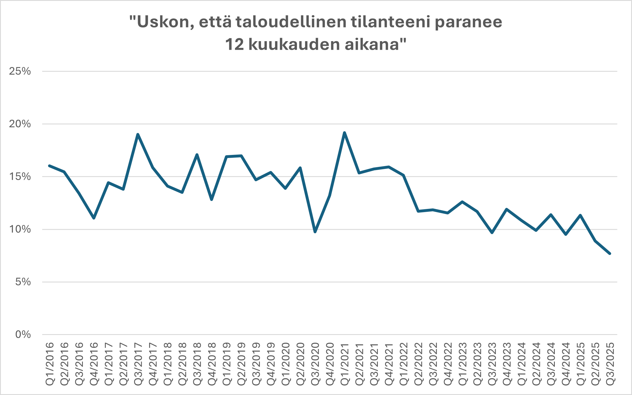 Etusivu » Ajankohtaista » Uutishuone » PAMin suhdannebarometri: Alle 8 prosenttia uskoo taloudellisen tilanteensa parantumiseen Tiedotteet 30.10.2025 08:02 PAMin suhdannebarometri: Alle 8 prosenttia uskoo taloudellisen tilanteensa parantumiseen Palvelualojen työntekijöiden usko oman taloudellisen tilanteensa paranemiseen seuraavan vuoden aikana on mittaushistorian alhaisin. Yli kolmannes koki taloutensa heikentyneen edelliseen vuosineljännekseen verrattuna. Palvelualojen ammattiliiton suhdannepaneeliin vastanneista 27 prosenttia koki työttömyyden uhan lisääntyneen. Osuus vastaajissa on isompi kuin koskaan sitten vuoden 2021 alun. Samanaikaisesti 26 prosenttia vastaajista uskoo, etteivät löytäisi uutta työpaikkaa, mikäli jäisivät nyt työttömäksi. Peräti 36 prosenttia koki, että heidän taloudellinen tilanteensa oli heikentynyt edelliseen vuosineljännekseen verrattuna. Osuus oli kuitenkin pienempi kuin vuosi sitten tai kuluvan vuoden alussa. Vastanneiden arviot työnantajayrityksen näkymistä seuraaville 12 kuukaudelle pysyivät vielä positiivisen puolella, vaikkakin suunta on ollut hiipuva verrattuna kuluvan vuoden alkuun. Vain 8 prosenttia uskoi, että heidän oma taloudellinen tilanteensa on paranemassa seuraavan vuoden aikana. Näin vähäistä usko oman talouden parantumiseen ei ole aikaisemmin ollut PAMin jäsenille suunnatussa suhdannekyselyssä. Kaupan alalla työskentelevistä suhdannepaneeliin vastaajien käsitys työnantajayrityksensä talouden tilanteesta oli positiivisempi kuin viime vuonna vastaavana ajankohtana. Arviot työnantajayrityksen talouden kehittymisestä seuraavan 12 kuukauden aikana pysyivät ennallaan verrattuna vuoden takaiseen, kun 33 prosenttia uskoi sen paranevan ja 21 prosenttia heikkenevän. Kaupan alan vastaajien arviot oman taloutensa kehittymisestä viimeiseen 3 kuukauden aikana synkkenivät edellisestä vuosineljänneksestä. Työttömyyden uhka oli kasvanut vuoden takaisesta, mutta ei juurikaan muuttunut kuluvan vuoden aikaisemmista vuosineljänneksistä. Majoitus- ja ravintola-alan vastaajista 31 prosenttia näki, että heidän työnantajayrityksensä taloudellinen tilanne oli heikentynyt edellisestä vuosineljänneksestä. Näkemys oli negatiivisempi kuin vuosi sitten. Huolet oman talouden suhteen olivat ennallaan viime vuoden vastaavaan ajankohtaan verrattuna. Kiinteistöpalvelualalla työskentelevien vastauksista kävi ilmi, että he arvelivat työnantajayrityksen tilanteen heikentyneen. Kuluvan vuoden aikaisempia vuosineljänneksiä useammin vastaajat näkivät työnantajansa taloudellisen tilanteen heikentyneen edellisestä vuosineljänneksestä. Arviot olivat synkempiä kuin vuosi sitten vastaavana ajankohtana. Myös arviot työnantajayrityksen näkymistä seuraavalle 12 kuukaudelle olivat edellistä vuosineljännestä ja vuoden takaista synkempiä. Toisaalta kiinteistöpalvelualalla työskentelevillä huolet omassa taloudessa pysyivät ennallaan. Vastaajista 26 prosenttia uskoi taloudellisen tilanteensa heikkenevän seuraavan vuoden aikana ja 22 prosenttia paranevan. Peräti 29 prosentti näki, etteivät enää työllistyisi, mikäli menettäisivät nyt työpaikkansa. Vartiointialan vastaajista peräti 43 prosenttia arvioi työnantajayrityksensä taloudellisen tilanteen olevan heikkenemässä seuraavan 12 kuukauden aikana. Osuus on aikaisempaan suhdannekyselyhistoriaan verrattuna poikkeuksellisen korkea. Suhdannepaneelin kysymyksiin vastasi 930 liiton työssäkäyvää jäsentä. Vastauksia kerättiin 1.-14.10.2025. Suhdannebarometri on toteutettu vuosineljänneksittäin vuodesta 2014 alkaen. Tutustu aiempiin barometreihin Avainsanat: elinkeinot kaupan ala kiinteistöpalveluala matkailu- ja ravintola-ala talous työllisyys vartiointiala Mitä pidit tästä sisällöstä? URLKenttä on validointitarkoituksiin ja tulee jättää koskemattomaksi.Reaktio(Pakollinen) Tämä oli hyödyllinen Pidin kovasti tästä sisällöstä En ymmärtänyt Ei ollut hyödyllinen Kommentti (valinnainen)CAPTCHA Jaa Lue seuraavaksi Uutiset kiinteistöpalveluala Kiinteistöpalvelualan uusi työehtosopimusmääräys tuo selkeyttä lumityöntekijöiden työvuoroluettelon muutoksiin 27.10.2025 Uutiset matkailu- ja ravintola-ala matkailu- ja ravintola-alan esihenkilöt PAM selvittää: Mitä kuuluu matkailu- ja ravintola-alalla työskenteleville? 20.10.2025 Lausunto 1/2025 Työikäisten ruokailusuositusluonnoksesta. Lausunto Valtion ravitsemusneuvottelukunnalle ja Terveyden ja hyvinvoinnin laitokselle. 14.10.2025 Näytä kaikki
