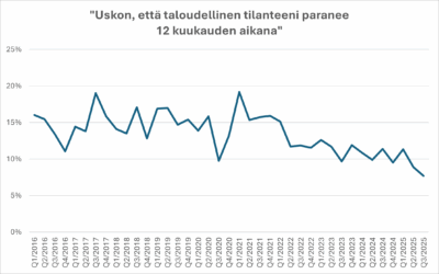 Etusivu » Ajankohtaista » Uutishuone » PAMin suhdannebarometri: Palvelualojen työntekijöiden taloudellinen tilanne heikentyy Uutiset 15.08.2022 08:44 PAMin suhdannebarometri: Palvelualojen työntekijöiden taloudellinen tilanne heikentyy Yhä useampi suhdannebarometriin vastannut odottaa taloudellisen tilanteensa heikentyvän tulevan vuoden aikana. Arviot työnantajien taloudellisen tilanteen positiivisesta kehityksestä ovat yhtä lailla hiipuneet. Palvelualojen työntekijöiden työmarkkinatilanne jatkuu kuitenkin vastaajien arvioiden mukaan vahvana. Kiihtynyt inflaatio varjostaa Palvelualojen ammattiliitto PAMin suhdannebarometrin vastaajien talousnäkymiä, kertoo PAMin ekonomisti Olli Toivanen. Barometriin vastanneista palvelualojen työntekijöistä 36,8 prosenttia odottaa taloudellisen tilanteensa heikentyvän tulevan vuoden aikana ja vain 11,7 prosenttia arvioi sen parantuvan. Turvallisuusalalla työskentelevistä vastaajista 48,9 prosenttia kertoo taloustilanteensa heikentyneen myös kolmen kuukauden takaiseen verrattuna. Osuus on korkein alan vastaajien osalta yli seitsemään vuoteen. Kiinteistöpalvelualalla alkuvuoden kehitys on sen sijaan ollut kaksijakoista. Taloudellisen tilanteensa toteaa kolmen kuukauden takaiseen verrattuna kohentuneen 17,5 prosenttia alan vastaajista, mikä on korkein osuus sitten alkuvuoden 2018. Kuitenkin selvästi tätäkin useampi, 34,0 prosenttia, kertoo tilanteensa heikentyneen. ”Kiinteistöpalveluiden kysyntä on alkuvuodesta kohentunut ja alan tekijöille on ollut enemmän työtunteja tarjolla, mikä vaikuttaa tietysti suoraan monen toimeentuloon. Toisaalta kuluttajahintojen voimakas nousu on tarkoittanut tänä vuonna reaaliansioiden laskua valtaosalle työssäkäyvistä”, Toivanen toteaa. Arviot palvelualojen tulevan vuoden kehityksestä hiipuneet hieman Suhdannebarometriin vastanneiden arviot työnantajana toimivan yrityksen kehityksestä ovat heikentyneet hieman. Vastaajista 17,6 prosenttia arvioi työnantajansa taloudellisen tilanteen heikentyvän tulevan vuoden aikana, kun vielä edellisessä kyselyssä vastaava osuus oli 11,9 prosenttia. Matkailu- ja ravintola-alalla työskentelevistä vastaajista enää 37,5 prosenttia odottaa työnantajansa taloudellisen tilanteen paranevan tulevan vuoden aikana, kun vielä kolmen kuukauden takaisessa kyselyssä vastaava osuus oli 54,2 prosenttia. ”En pitäisi tätä välttämättä vain negatiivisena merkkinä. Etenkin ravintola-ala on nauttinut monella tapaa ennätyksellisestä kesäkaudesta, josta on huomattavasti vaikeampaa ponnistaa enää taloudellisesti ylöspäin kuin esimerkiksi talven koronakuopasta”, Toivanen huomauttaa. Palvelualojen työmarkkinatilanne jatkui kesällä vahvana Matkailu- ja ravintola-alan vastaajista peräti 30,1 prosenttia arvioi löytävänsä uuden työpaikan tarvittaessa jo kuukauden sisällä – korkein osuus alan vastaajista PAMin suhdannebarometrin historiassa. Palvelualojen työntekijöiden työmarkkinatilanne koetaankin edelleen laajalti vahvana. Esimerkiksi kaupan alan vastaajista peräti 61,5 prosenttia ei tunne lainkaan työttömyyden uhkaa. Osuus on yhtä lailla korkein suhdannebarometrin historiassa. ”Koronasulkujen päätyttyä kysyntä erityisesti ravintola-alan ammattilaisista on ollut odotetusti valtavaa. Myös kaupan ja tukipalveluiden kuten siivouksen ja vartioinnin palkansaajien työtuntien kehitys on jatkunut vahvana”, Toivanen kertoo. Tiedot perustuvat PAMin tekemään kyselyyn, joka toteutettiin 1.−31.7.2022. Kyselyyn vastasi 816 PAMin jäsentä. PAM julkaisee suhdannebarometrin vuosineljänneksittäin. Teksti on 15.8.2022 lähetetty mediatiedote. Avainsanat: talous toimeentulo Mitä pidit tästä sisällöstä? LinkedInKenttä on validointitarkoituksiin ja tulee jättää koskemattomaksi.Reaktio(Pakollinen) Tämä oli hyödyllinen Pidin kovasti tästä sisällöstä En ymmärtänyt Ei ollut hyödyllinen Kommentti (valinnainen)CAPTCHA Jaa Lue seuraavaksi Tiedotteet elinkeinot kaupan ala kiinteistöpalveluala matkailu- ja ravintola-ala talous työllisyys vartiointiala PAMin suhdannebarometri: Alle 8 prosenttia uskoo taloudellisen tilanteensa parantumiseen 30.10.2025 Blogit politiikka toimeentulo Samppanjaa kahvikupeista 17.10.2025 Lausunto 1/2025 Työikäisten ruokailusuositusluonnoksesta. Lausunto Valtion ravitsemusneuvottelukunnalle ja Terveyden ja hyvinvoinnin laitokselle. 14.10.2025 Näytä kaikki