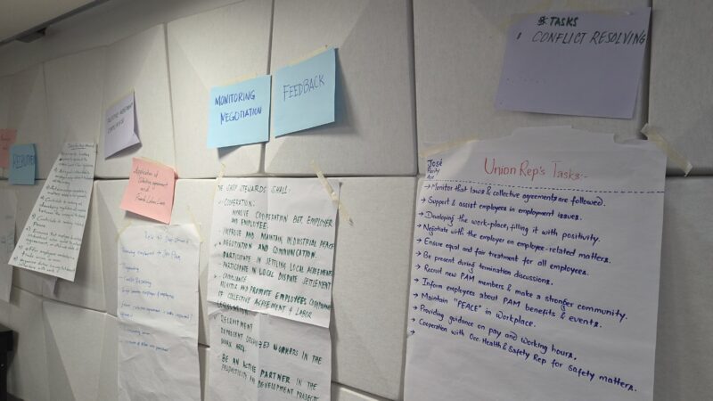 Etusivu » Ajankohtaista » Uutishuone » Tieto antaa varmuutta uusille luottamushenkiöille Artikkelit 25.02.2026 10:09 Tieto antaa varmuutta uusille luottamushenkiöille PAMin ensimmäisellä englanninkielisellä luottamushenkilöiden peruskurssilla uudet luottamusmiehet ja työsuojeluvaltuutetut saivat tietoa, inspiraatiota ja verkoston. Rama Pandey, Stéphanie Mazor, Mariano Keri ja Germain Ishimwe ovat vastavalittuja työpaikkojensa luottamushenkilöitä. Helmikuu 2026 Helsingissä. Huone oli täynnä vilkkaita keskusteluja ja naurua, kun 22 vastavalittua luottamus- ja työsuojeluvaltuutettua kokoontui PAMin ensimmäiselle kolmipäiväiselle luottamushenkilöiden peruskurssille englanniksi. Ryhmätyöstä syntyneet värikkäät muistiinpanot ja piirrokset täyttivät seinät. Koulutus ei ollut pelkkä tilaisuus oppia tehtävään liittyviä perusasioita kielellä, jonka he hallitsevat suomea paremmin. Se oli myös ensimmäinen mahdollisuus tavata muita maahanmuuttajataustaisia luottamushenkilöitä. Viime syksynä valittiin monia uusia luottamusmiehiä ja työsuojeluvaltuutettuja. Yhä useampi heistä on maahanmuuttaja, joka ei vielä puhu suomea tai ruotsia sujuvasti. Tähän asti se on tarkoittanut myös sitä, että osa edustajista on joutunut ryhtymään tehtävään ilman koulutusta työoikeudesta ja työehtosopimuksista englanniksi. ”Huomasin, että muillakin oli samat ongelmat” Osallistujat tulivat eri työpaikoilta ja toimialoilta, mutta heidän tiensä luottamusmiehiksi olivat usein samankaltaiset: Kollegat kääntyvät luotettavan henkilön puoleen. Kun ongelma pitää ratkaista, he päättivät ottaa asian puheeksi. Rama Pandey, Palmian siivousalalla vasta valittu luottamusmies, kertoi ottaneensa aluksi yhteyttä PAMiin kysymyksillä sairauslomasta ja sairausajan palkasta. – Palmialla ei ollut siivousalalla omaa luottamusmiestä. Tiesin, että PAM auttaa kysymyksissäni, mutta huomasin, että muillakin oli samat ongelmat. Kun kukaan muu ei ryhtynyt tehtävään, hän astui esiin. ”Sinähän teet sitä jo” Clarion Hotel Mestari -hotellissa Stéphanie Mazor koki samanlaista. Nykyään hän on työsuojeluvaltuutettu, mutta aluksi hänellä ei ollut virallista roolia. – Jotkut työkaverit, jotka kokivat vaikeaksi “valittaa”, pyysivät minua puhumaan heidän puolestaan. Heillä ei silloin ollut työsuojeluvaltuutettua, ja kun esihenkilö yritti rajoittaa wc:n käyttöä, hän oli ainoa, joka uskalsi nostaa asian esiin. – Sen jälkeen ihmiset työnsivät minua entistä enemmän siihen rooliin. He sanoivat: ’Sinähän teet sitä jo.’ Niinpä ajattelin, että kannattaa oppia lisää ja tehdä asioita järjestelmällisemmin. Mariano Keri, Vihannes-Laitilan luottamusmies, joka valittiin vuonna 2024 ja uudelleen kaudelle 2026–2027, astui esiin, kun vuosilomasuunnittelussa ilmeni ongelmia. – Vuosilomaan liittyen oli ollut ongelmia ja kysymyksiä. Teemme töitä varmistaaksemme, että käsittely on läpinäkyvää ja että kaikkia kohdellaan tasapuolisesti. Hän kiittää myös edeltäjäänsä siitä, että tämä piti työpaikalla yllä rakentavaa vuoropuhelua. – Hän hoiti homman hyvin ja ylläpiti sopua. Pyrin jatkamaan sitä. Tieto, verkostot ja itseluottamus Seinät olivat täynnä värikkäitä muistilappuja ja piirustuksia, joita ryhmätyö oli tuottanut. Osallistujille englanninkielinen kurssi tarjosi sekä käytännön työkaluja että yhteisöllisyyden tunteen. Mariano kertoi, että kurssi toi hänelle uuden verkoston ja uutta osaamista. –Saat ideoita oman työpaikkasi kehittämiseen. Lisäksi sinulla on työkalut ja verkostot ongelmien ratkaisemiseen, jos niitä ilmenee. Rama kuvaili koulutusta “erittäin informatiiviseksi”. – Opin lisää lainsäädännöstä ja työehtosopimuksesta. Nyt osaan lukea niitä paremmin ja selittää myös muille. Germain Ishimwe on toiminut Laplandia Marketin luottamusmiehenä ja työsuojeluvaltuutettuna vuodesta 2024. Hän kertoo olevansa erittäin iloinen englanninkielisestä koulutuksesta, koska aiemmin oli hankalampaa. Hän lisää, että hän tunsi olonsa mukavammaksi tässä ryhmässä. – En puhu suomea sujuvasti, ja täällä kaikki ovat maahanmuuttajia. Hän toivoo, että PAM järjestää jatkokursseja myös englanniksi. ”On todella arvokasta kuulla muiden kokemuksia.” Stéphanie arvosti koulutuksen käytännönläheisyyttä. – Saat perustiedot työlainsäädännöstä ja työehtosopimuksista. Ne tuovat selkeyttä ja rakennetta. Lisäksi muiden kokemusten kuuleminen on erittäin arvokasta. Kun edustajat kartuttavat tietoa, he saavat myös jotain vähemmän käsinkosketeltavaa mutta yhtä tärkeää: itseluottamusta. Tieto tuo varmuutta, ja varmuus tuo auktoriteettia. Sinut otetaan vakavammin. Tiedät vastauksen, tai ainakin tiedät, mistä sen löydät, Stéphanie sanoi. Germain oli samaa mieltä. Kurssi on hänen mukaansa vahvistanut hänen varmuuttaan tehtävässään. Muutoksia voi saada aikaiseksi työpaikalla ja laajemminkin, kun ottaa asioita puheeksi ja on tarpeeksi tietoa tehdä se tsevarmuudella. Teksti ja kuvat: Hildur Boldt Lue lisää työpaikan luottamushenkilöistä Lue myös Katso kaikki Artikkelit Herätä luottamus kiinteistöpalveluala työpaikan luottamushenkilöt työturvallisuus ”Työsuojeluvaltuutetun tehtävä on näköalapaikka” 16.9.2025 Artikkelit Herätä luottamus kaupan ala työpaikan luottamushenkilöt Helena Lentz: ”Luottamusmies on kuuntelija ja vaikuttaja” 16.9.2025 Artikkelit Herätä luottamus matkailu- ja ravintola-ala työpaikan luottamushenkilöt Astu esiin ja tartu toimeen 19.6.2025 Artikkelit Herätä luottamus kaupan ala työpaikan luottamushenkilöt Kahden kulttuurin Normal 4.2.2025 Uutiset Herätä luottamus työpaikan luottamushenkilöt Espresso Houseen luottamusmies työntekijöiden tueksi 27.6.2022 Artikkelit Herätä luottamus matkailu- ja ravintola-ala työpaikan luottamushenkilöt työsuhde Luottamusmies paras tapa ennaltaehkäistä on