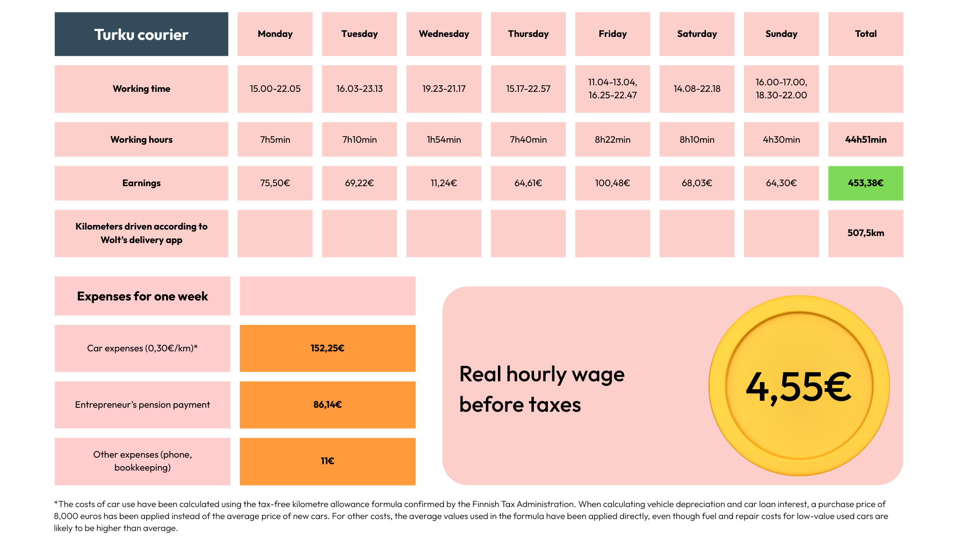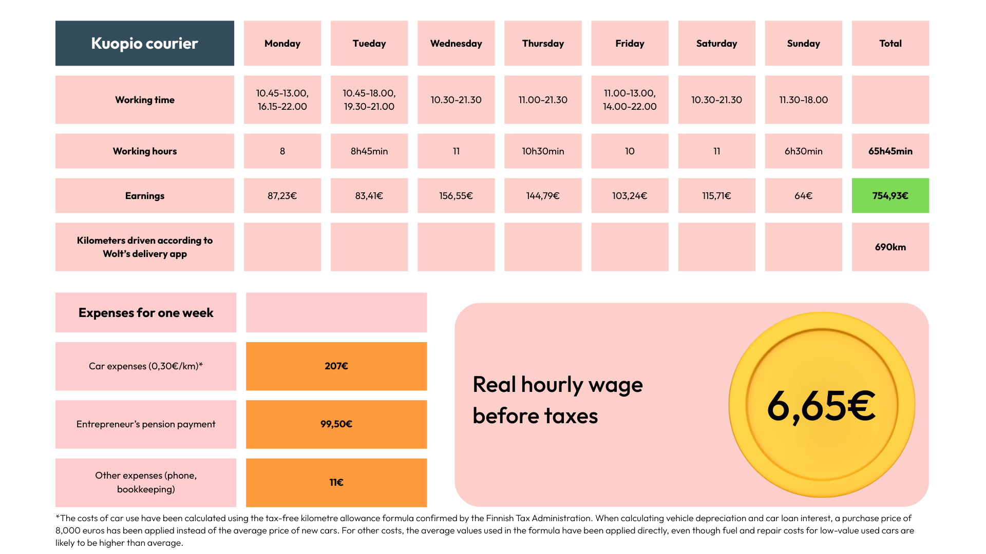 Home » Under four euros an hour – PAM’ findings reveal Wolt couriers’ real earnings Articles 05.02.2026 10:00 Under four euros an hour – PAM’ findings reveal Wolt couriers’ real earnings After expenses, a courier working an almost 60-hour week may be left with less than four euros per hour before tax. Three Wolt couriers tracked their working hours, kilometres driven and fees for one week. The results reveal that couriers’ real hourly earnings are extremely low. — This is absurd in a welfare state. We are like ants on the street. I can see in my colleagues’ eyes that they could cry. That is how harsh the reality is. The man, who moved from Bangladesh to Vaasa to study in 2018, has worked as a Wolt courier in Turku for more than five years. He holds a bachelor’s degree in international business. The Turku-based courier and two other Wolt couriers from different parts of Finland tracked their working hours, kilometres driven and fees for one week in January 2026. PAM has seen screenshots from the couriers’ Wolt app showing paid fees and accumulated driving distances. The interviewees do not appear under their own names, as they fear possible consequences from their contracting partner, Wolt. Couriers have no form of protection against termination. PAM is aware of the identities of all interviewees. Helsinki courier, January 2026 A courier’s real hourly pay before tax is just a few euros Wolt does not disclose its couriers’ hourly pay. The company states that the “average fee during active time” is 20–21 euros per “active hour”. This message has also been repeated by Wolt’s founder, Miki Kuusi. Only the time spent carrying out deliveries is included in this calculation. Time spent waiting between deliveries is not included in Wolt’s examples. In the examples used in this article, working time includes the time when the courier is active and available to receive orders. If the courier took a break during the day, that time has not been counted as working time. According to the Turku-based courier, the real hourly pay after expenses is extremely low. — In its examples, Wolt only counts the time when you are picking up or delivering an order. That is misleading. The true hourly pay is terrible. I have no decision-making power, and as an “entrepreneur” I cannot decide the price of my work. What kind of entrepreneurship is that? Based on his tracking week, the Turku courier’s real hourly pay is four and a half euros per hour. Turku courier, January 2026 A courier living in Kuopio has been living in Finland since 2008. He has graduated in Finland with a master’s degree in information technology and has worked as a Wolt courier for almost eight years. — Previously, Wolt treated us like partners, and we had, for example, monthly meetings. Nowadays I work long days because fees have been cut unilaterally. To pay my bills, I need to earn 100 euros a day in fees. I keep riding until I reach that. Yesterday I worked twelve hours to earn 116 euros before expenses and taxes, he says. Wolt has significantly reduced couriers’ fees in recent years. The company can cut fees unilaterally without negotiations, as it treats couriers as entrepreneurs. According to the Kuopio courier, expenses are substantial. Pension contributions alone amount to 398 euros per month, and fuel costs almost one hundred euros per week. In addition, the courier must pay for car insurance, accounting services and the phone used for work. Even if the car has been acquired cheaply, maintenance is expensive due to heavy use. — This year alone, I have already spent almost one thousand euros on car repairs. Kuopio courier, January 2026 “This is not freedom” A Helsinki-based courier with more than five years of experience working as a Wolt courier has lived in Finland for over 10 years and originally comes from East Africa. — I am so exhausted. Sometimes I work more than 60 hours a week. It doesn’t feel good to work 10–15 hours a day and come home empty-handed. Wolt often claims publicly that its entrepreneurial model gives couriers freedom. Do couriers feel that they have genuine freedom as Wolt delivery partners? — No, no, no, absolutely not. I can choose when I start working, but I cannot choose how much I will earn. This is manipulated freedom, the Turku courier says. — Look at the definition of partnership and entrepreneurship. This is not genuine entrepreneurship; we have no say whatsoever. This situation should not be sugar-coated — this is modern-day slavery. I do not understand why the Finnish government allows this. There is no excuse for allowing people to be exploited in the way Wolt does, the Helsinki courier states. — Wolt calls this freedom, but they define all the terms. They say I am free, while at the same time setting conditions under which I am not free. They say I am free to come to work. I have been logged in and available to receive orders for 90 minutes and earned four euros. This is not freedom. Having to work unlimited hours to earn one hundred euros is not freedom. There is no sense of freedom in this, the Kuopio courier says. Wolt often advertises freedom as one of the benefits of being a courier entrepreneur. The couriers interviewed by PAM consider Wolt’s notion of freedom to be manipulative. Wolt enables the exploitation of substitute couriers and does not intervene At the end of January, YLE reported in a wide-ranging article on the resale of Wolt courier accounts. According to information PAM has received from couriers, the use of so-called substitutes is now very common. Wolt has not disclosed the number of substitutes publicly. Substitutes pay rent for the use of an account amounting to 30–40 per cent of their earned fees, or even a fixed monthly fee of several hundred euros. If an intermediary were to take one third of the earnings in the hourly pay calculations presented in this article, the substitute courier’s hourly pay 