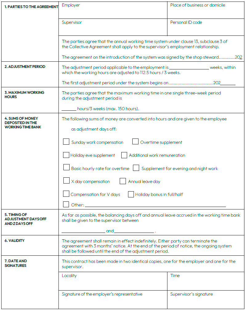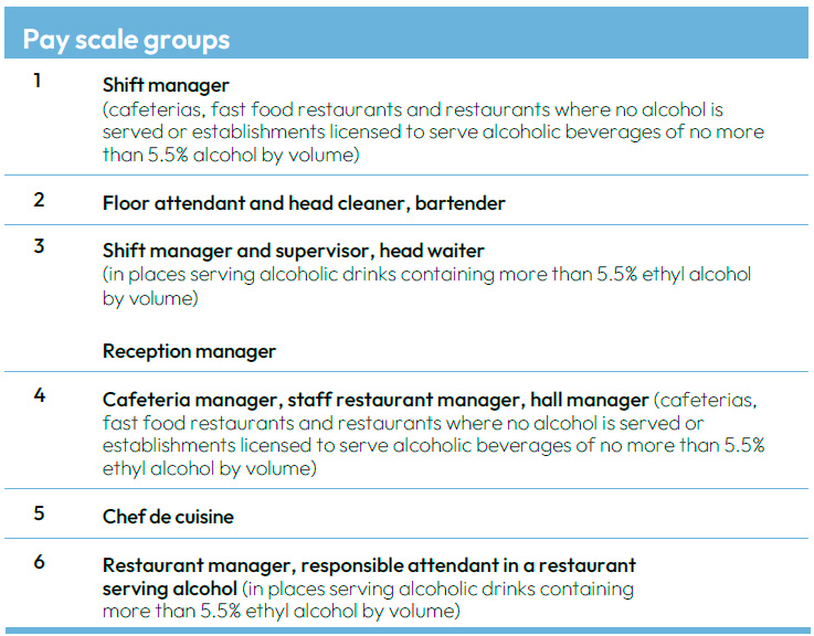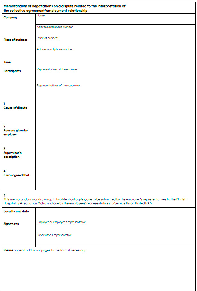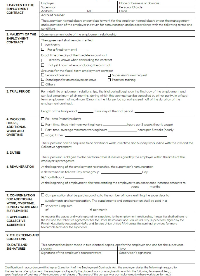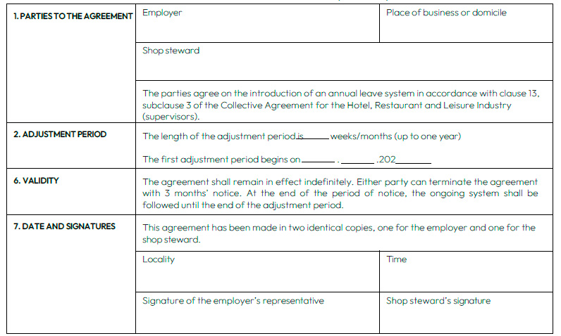 Home » Collective agreement for supervisors in hotel, restaurant and leisure industry » Collective agreement for the hotel and restaurant supervisors ← Back to table of contents Collective agreement for the hotel and restaurant supervisors Table of contents Open or close menu Back to table of contents Collective agreement for the hotel and restaurant supervisors 1. SCOPE OF APPLICATION1 Scope of the agreement2. EMPLOYMENT RELATIONSHIP2 Supervision and freedom of association3 General obligations of the employer and the supervisor4 Employment contract and trial period5 Employment contract valid indefinitely (permanent contract)6 Fixed-term employment contract3. WORKING TIME7 Obligation to offer additional work8 Regular working hours and the length of a working day9 Organisation of working hours10 Roster11 Special public holidays12 Annual leave system (VV)13 Specific working hour schemes for full-time supervisors4.REMUNERATION14 Form of remuneration15 Determining the amount of remuneration16 Factors increasing remuneration17 Work on Sundays, public and church holidays, and eves of holidays18 Additional work and overtime19 Work done on a day off20 Conversion of increased pay to days off21 Payment of salary supplements as separate monthly remuneration22 Payment of wages5. ABSENCES23 Absence due to illness24 Medical examinations25 Temporary leave of absence26 Family leave27 Remuneration during pregnancy and parental leave6. ANNUAL HOLIDAYS28 Annual holidays29 Holiday bonus7. TRAVEL30 Travel expenses8.LOCAL COLLECTIVE BARGAINING31 Local collective bargaining9. MISCELLANEOUS PROVISIONS32 Collection of union membership fees33 Workplace meetings34 a Prevention of violence34 b Promoting occupational wellbeing34 c Recovery of cash register deficits34 d Position of a person providing orientation35 Workplace visits36 Group life insurance37 Workplace meals38 Uniforms10. CHIEF SHOP STEWARD, OCCUPATIONAL SAFETY REPRESENTATIVE, NEGOTIATING PROCEDURE AND INDUSTRIAL PEACE39 Chief shop steward and occupational safety representative40 Negotiating procedure41 Industrial peace and breaches of the collective agreement11. INFORMATION ON AND VALIDITY OF THE COLLECTIVE AGREEMENTCommunications and information on the collective agreementValidity of the collective agreementAPPENDICESProtocol for unforeseeable and exceptional circumstancesProtocol on the renewal of the Collective Agreement for the Hotel, Restaurant and Leisure IndustryHotel, restaurant and leisure services – supervisors’ remunerationEmployment contractAgreement on the introduction of a working time bankAgreement on a working time bankTemplate for the memorandum of dispute 1. SCOPE OF APPLICATION1 Scope of the agreement This collective agreement shall be followed in the hotel and restaurant sector, as well as in comparable or closely related or supporting activities, in the tourism and leisure services defined below and in wellness services associated with the above. Typically, the scope of application of this collective agreement covers: restaurants, cafés, pubs, nightclubs catering companies and staff restaurants convenience food and catering kitchens hotels and other accommodation establishments spas and wellness centres camping and caravan areas holiday villages and cottages agritourism services service stations and motorway traffic stations bowling alleys holiday and course centres congress centres promotion, sales, marketing and agency of domestic (Finnish) tourism services The collective agreement applies to supervisors and personnel in actual positions of responsibility as designated by the employer covered by the Working Hours Act, providing that the person is tasked with managing or supervising the work of employees. A person within the scope of the collective agreement may also take part in the work done by the employees that they are managing and supervising. The collective agreement does not apply to: 1. personnel in an independent managerial position within the company or part thereof, or 2. personnel who are entitled to negotiate and decide on the remuneration and other working conditions of employees in the capacity of the employer’s representative. The prerequisite for this is that the person concerned has a continuous independent entitlement to hire and dismiss employees and to negotiate and make local agreements with employees or their representatives on remuneration and other working conditions of employees in negotiations conducted in accordance with the collective agreement. Unless otherwise expressly stated for personnel in positions of responsibility, the working and remuneration conditions of such personnel shall comply with the provisions applying to supervisors. The following agreements shall apply as part of this collective agreement: General agreement, 1 October 2017 Agreement on shop stewards, 1 January 2021 Training agreement, 1 January 2021 Recommendations for preventing substance abuse problems, handling matters of substance abuse and referral for treatment in workplaces Agreement on workplace meals, 1 October 2017 Protocol applying to compensatory fines in accordance with the Collective Agreements Act, 1 October 2017 Agreement on the collection of trade union membership fees, 1 October 2017 Agreement on cooperation in health and safety matters, 1 January 2021 Cooperation agreement, 1 October 2017 Agreement on on-the-job learning, 1 March 2018 2. EMPLOYMENT RELATIONSHIP2 Supervision and freedom of association The employer shall manage and assign work. The employer shall hire and dismiss supervisors. A supervisor hired for a particular type of work shall be obliged, if necessary, to perform other similar or comparable work that does not essentially change the ordinary work. In addition to the orientation and instruction given at the beginning of employment, the employer shall provide supervisors with information on the policies regarding breaks in the workplace, working time arrangements, instructions regarding