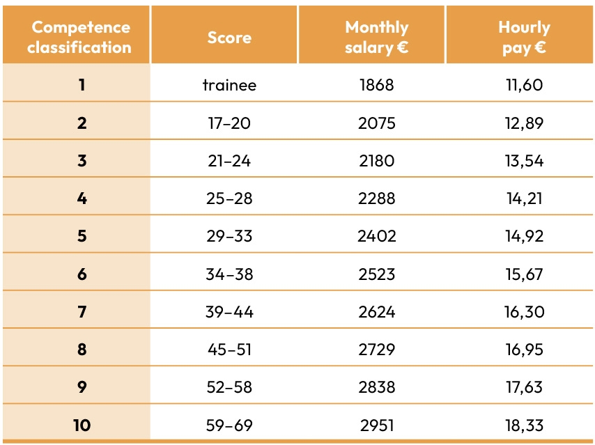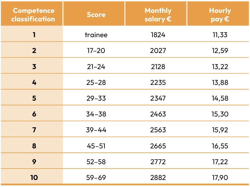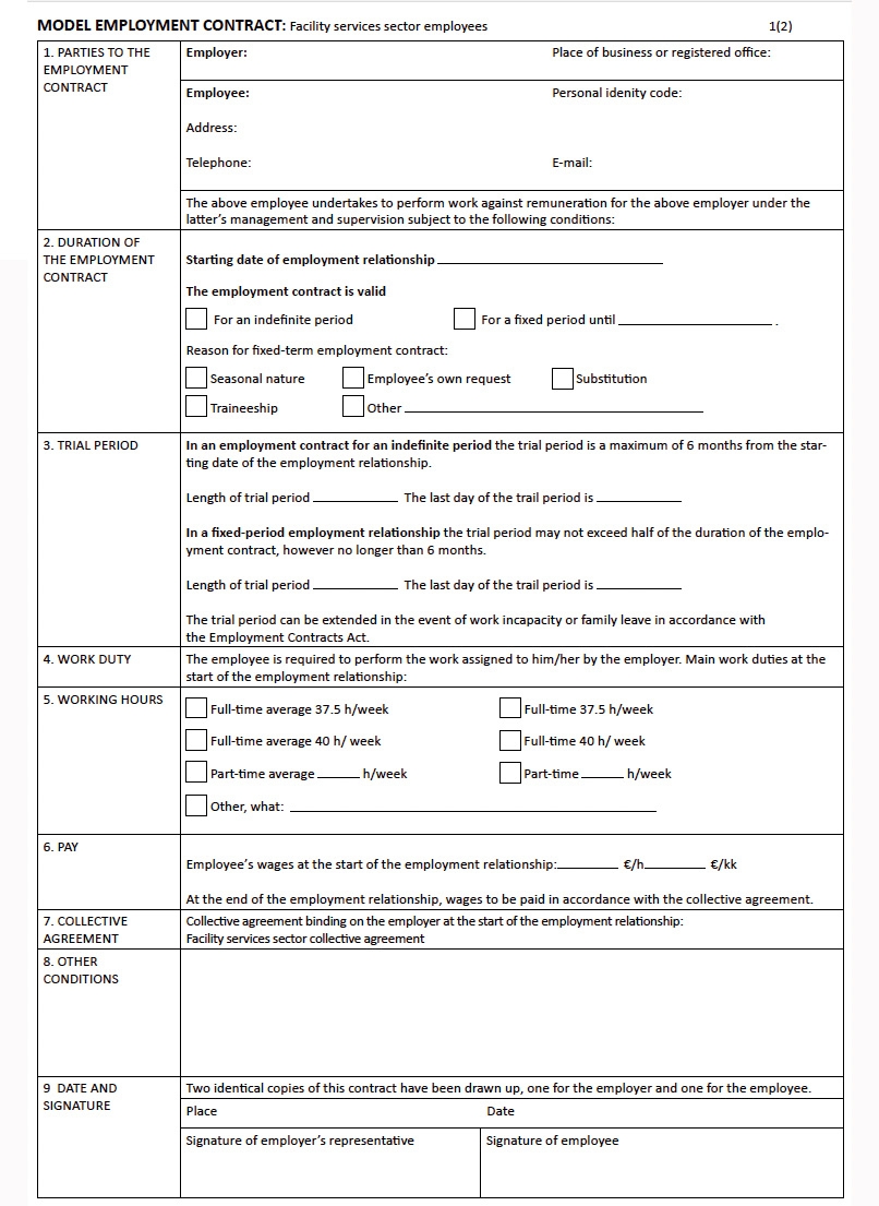 Home » Collective agreement for property services sector » COLLECTIVE Agreement for the Facilities Services Sector ← Back to table of contents COLLECTIVE Agreement for the Facilities Services Sector Table of contents Open or close menu Back to table of contents COLLECTIVE Agreement for the Facilities Services Sector REAL ESTATE EMPLOYERS SERVICE UNION UNITED PAMI GENERAL PROVISIONSSection 1 ScopeSection 2 Central organisation agreementsSection 3 Training agreementII EMPLOYMENTSection 4 Supervision of workSection 5 Right to organiseSection 6 Employment contract and trial periodSection 7 Termination of employment1. Period of notice3. Fixed term contract4. Lay-off notice period5. Negotiation proposal period in accordance with the Act on Co-operation within Undertakings6. Limit to the geographical area of the obligation to offer work during a fixed-term lay-offSection 8 Working time1. Regular working hours2. Working week and working day3. Work schedule and working hours adjustment system4. Daily rest periods5. Daily rest period6. Weekly free time7. Night work8. Sunday work9. Additional work and overtime10. On-call duty11. Days off12. Combinations of days off13. Time assigned for training, orientation and meetings14. Orientation15. Establishment of a part-time employee’s working hoursIV COMPENSATIONSection 9 Payment regulations1. Determination of wages2. Average hourly earnings3. Hourly and daily wage divisors4. Salary for a partial month6. Compensation for midweek holidays (valid until 31 December 2026)Annual leave system (valid from 1 January 2027)Section 10 Increases to compensation1. Compensation for additional time and overtimeCalculation instructions2. Termination of employment contract in the middle of an adjustment period3. Supplements for evening, night and shift work4. Seniority supplement5. Emergency work6. Compensation for eves of holidays and certain Saturdays7. Exchange of pay for time off8. Body waste supplementV ABSENCESSection 11 Illness1. Duty to declare and medical certificate2. Preconditions of payment of wages3. Payment of sick pay4. Amount of sick pay5. Recurrence of illness6. Absence due to illness without a medical certificateSection 12 Temporary absence1. Sudden illness of a child under 102. Other temporary absences3. Annual holiday benefitsSection 13 Medical examinationsSection 14 Family leaveVI ANNUAL HOLIDAYSection 15 Annual holidays1. Determination of holiday payCoefficient tables2. Agreement on the date of payment of holiday paySection 16 Holiday bonus1. Amount2. Date and conditions of payment3. Other agreement on payment of holiday bonus or exchange for time off4. Exceptional payment of holiday bonusVII Section 17 Travel1. Business trips2. Travel expenses3. Compensation for travel timeSection 18 Local agreementIX SHOP STEWARDSection 19 Shop stewardX OCCUPATIONAL SAFETY AND INDUSTRIAL SAFETYSection 20 Occupational safetySection 21 Industrial safety delegateXI OTHER PROVISIONSSection 22 Group life assuranceSection 23 Trade union membership feesSection 24 Assembly at the workplaceSection 25 Work clothes and toolsSection 26 Order of negotiationsSection 27 Industrial peaceSection 28 Validity of the agreementATTACHMENTSAttachment 1 Salary system for the facilities services sectorAttachment 2 Minutes on reducing work time for employees in the facilities services sectorAttachment 3 Shop steward agreementAttachment 4 Training agreementAttachment 5 Minutes on prevention of violence threatsAttachment 6 Model employment contractAttachment 7 Agreement on on-call dutyAttachment 8 PROTOCOL ON THE CONCLUSION OF THE COLLECTIVE AGREEMENT FOR EMPLOYEES IN THE FACILITY SERVICES SECTORAttachment 10 Alternative small companies modelAttachment 11 Minutes in the event of unforeseeable and exceptional circumstances This in an English translation of the original Finnish collective agreement. The contractual parties to the collective agreement are not bound by the English translation. If the English translation allows for a different interpretation than the original Finnish wording, the Finnish wording shall prevail. The contractual parties to the collective agreement are not responsible for any damage resulting from possible errors in the translation. Tämä on käännös suomenkielisestä työehtosopimuksesta. Työehtosopimuksen sopijaosapuolet eivät ole sopineet englanninkielisestä työehtosopimustekstistä. Mikäli englanninkielisen käännöksen tulkinta johtaa erilaiseen lopputulokseen kuin alkuperäinen suomenkielinen työehtosopimus, tulee noudattaa suomenkielistä työehtosopimusta. Työehtosopimuksen sopijapuolet eivät vastaa käännöksen mahdollisista virheellisyyksistä aiheutuvista vahingoista. REAL ESTATE EMPLOYERS SERVICE UNION UNITED PAMI GENERAL PROVISIONSSection 1 Scope This collective agreement on terms of employment shall apply to workers employed in the facilities services sector. Entry on record Working tasks are cleaning property maintenance technical services facility services landscaping services and tasks closely related to these. Section 2 Central organisation agreements The Co-operation Agreement PT–SAK 3 December 1997 (10 May 2001) shall be adhered to as part of this collective agreement. If the central organisations conclude a new agreement during the period of this agreement, it shall be taken as part of this agreement if the parties thus agree separately. Section 3 Training agreement As part of the collective agreement, the training agreement between the Real Estate Employers and Service Union United PAM (Attachment 4) shall be adhered to. II EMPLOYMENTSection 4 Supervision of work The employer shall supervise and distribute work, and hire and discharge employees. Section 5 Right to organise The right to organise is inviolable on both sides. The employer informs a new employee about the organisation and negotiation relations in the branch and who is the shop steward and the safety representative at the workplace and gives their contact data. Sec