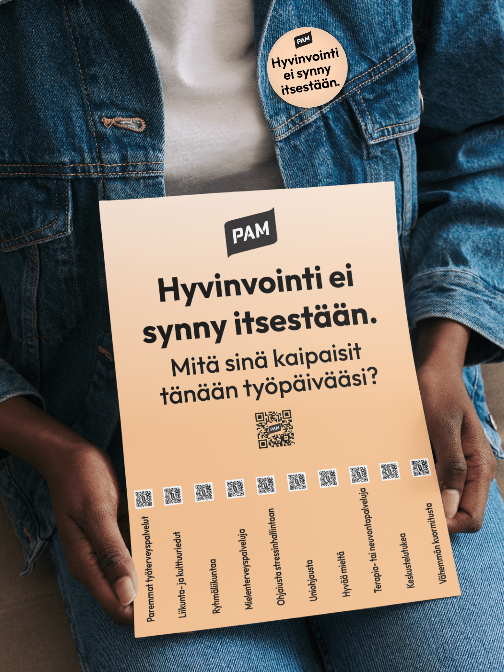 Etusivu » Hyvinvointi ei synny itsestään Hyvinvointi ei synny itsestään Nuorten yleisin työkyvyttömyyden syy on mielenterveyden häiriöt. Työpaikan liikuntaetu ja mielenterveyspalvelut voivat auttaa. Vaaditaan hyvinvointia, joka kuuluu kaikille! Tutustu vetoomukseen Tilaa kampanjapinssejä ja -juliste työpaikallesi Mielenterveyden tukeminen työpaikalla on paljon enemmän kuin kuulumisten kysymistä tai hyvän ilmapiirin ylläpitämistä. Tarvitsemme työnantajalta konkreettisia toimia. Mistä kampanjassamme on kyse? Kampanjan ideana on kerätä työntekijöiden allekirjoituksia vetoomukseen, jonka pohjalta työpaikalla voidaan neuvotella vetoomuksen vaatimuksien täyttämiseksi. Voit tulostaa vetoomuksen omalle työpaikalle itse ja kerätä allekirjoituksia. Vaihtoehtoisesti voit vinkata asiasta työpaikan työsuojeluvaltuutetulle tai luottamusmiehelle. Tulosta vetoomus Miksi vaadimme vetoomuksessa juuri liikuntaetua ja mielenterveyspalveluita? Alle 35-vuotiaiden työkyvyttömyystapauksista 81 % on mielenterveysperusteisia. Liikunta tutkitusti ehkäisee mielenterveysongelmia, täyttää psykologisia perustarpeita ja edesauttaa mieltä painavien asioiden käsittelemistä. Mielenterveyden kanssa ilmeneviin ongelmiin tulisi saada myös apua suoraan niihin perehtyneiltä ammattilaisilta. Sairauspoissaolot lisääntyvät, kun mielenterveyden juurisyiden selvittämisen sijaan työterveyslääkärit hoitavat vain oireita. Eikö työpaikalla jo ole työterveyttä? Työterveyden tarjoamat palvelut vaihtelevat työpaikoittain, useilla työpaikoilla mielenterveyspalvelut eivät kuulu työntekijöille osana työterveyttä. Mitä hyötyä työnantajalle on tästä? Työnantaja hyötyy siitä, että työntekijöiden sairauspoissaolot vähenevät ja työntekijöiden kokonaisvaltainen työhyvinvointi lisääntyy. Miten kerään vetoomukseen allekirjoituksia? Voit tulostaa vetoomuksen tältä sivulta ja viedä vetoomuksen esimerkiksi oman työpaikan taukotilaan, jossa allekirjoituksia on helppo kerätä. Kampanjaan osallistuvat voivat myös maksutta tilata kampanjapinssejä ja -julisteita työpaikalle. Tulosta vetoomus Tilaa kampanjamateriaaleja Kuinka paljon aikaa tämä vie minulta? Kyse on muutamasta tunnista: allekirjoitusten keräämisestä ja keskusteluista työnantajan kanssa. Me annamme kaiken pohjamateriaalin valmiina. Artikkelit työhyvinvointi ”Mielenterveyteen on saatava tukea työpaikoilla” 2.10.2025 Tilaa maksutta kampanjamateriaaleja työpaikallesi Levitetään yhdessä tärkeää viestiä työpaikoilla. Kampanjan pinsseillä ja julisteilla voit näyttää, että hyvinvointi on yhteinen asia – ja että se syntyy yhteistyöllä, ei itsestään. Pinssi on helppo tapa osoittaa tukea kampanjalle. Kiinnitä se työvaatteeseen, reppuun tai essuun ja herätä keskustelua hyvinvoinnista. Julisteet tuovat näkyvyyttä taukotiloihin, ilmoitustauluille ja neuvotteluhuoneisiin. Ne muistuttavat kaikkia siitä, että työntekijöiden hyvinvointi on jokaisen asia. Tilaa materiaalit maksutta alla olevalla lomakkeella ja jaa niitä työpaikallasi. Tehdään hyvinvoinnista yhteinen etu! Täytä tilauslomake tästä "*" näyttää pakolliset kentät Toivomani kappalemäärä julisteille / Önskat antal affischer / Desired number of posters*1 2345678910Toivomani kappalemäärä pinsseille / Önskat antal pins / Desired number of pins*5101520Nimi / Namn / Name* Etunimi / Förnamn / First name Sukunimi / Efternamn / Surname Sähköposti / E-post / E-mail* Puhelin / Telefon / Phone*Työpaikka / Arbetsplats / Workplace*Kaupunki / Stad / City*Osoite / Adress / Address*Olen allekirjoittanut vetoomuksen / Jag har undertecknat uppropet / I have signed the petition.* Kyllä / Ja / Yes Ei / Nej / No Olen työsuojeluvaltuutettu / Jag är arbetarskyddsfullmäktig / I am an occupational safety representative* Kyllä / Ja / Yes Ei / Nej / No Haluan lisätietoja siitä, miten työpaikkani voi lähteä kampanjaan mukaan. / Jag vill ha mer information om hur min arbetsplats kan delta i kampanjen. / I would like more information on how my workplace can join the campaign.* Kyllä / Ja / Yes Ei / Nej / No PAM voi käyttää tietojani yhteydenottoa ja/tai markkinointia varten. / PAM kan använda mina uppgifter för kontakt och/eller marknadsföring. / PAM can use my details for contacting me and/or for marketing* Kyllä / Ja / Yes Kampanjan taustavoimat Kampanjan on suunnitellut PAMin Nuorten ohjausryhmä, kymmenen hengen joukko nuoria aktiiveja. He ovat osa PAMin Nuoria, valtakunnallista verkostoamme, joka tarjoaa alle 31-vuotiaille jäsenille väyliä osallistua ja vaikuttaa. Tutustu nuorten toimintaan Lisätietoja kampanjasta Serveh Khalili järjestöasiantuntija , Vaikuttava järjestäminen -osasto serveh.khalili@pam.fi +35846 600 5857 Nuorten ja opiskelijoiden toiminta, nuorisopaneeli ja ohjausryhmä, oppilaitosten työelämätiedotus ja vapaaehtoiset työelämätiedottajat Järjestämisyksikkö Keskustoimisto