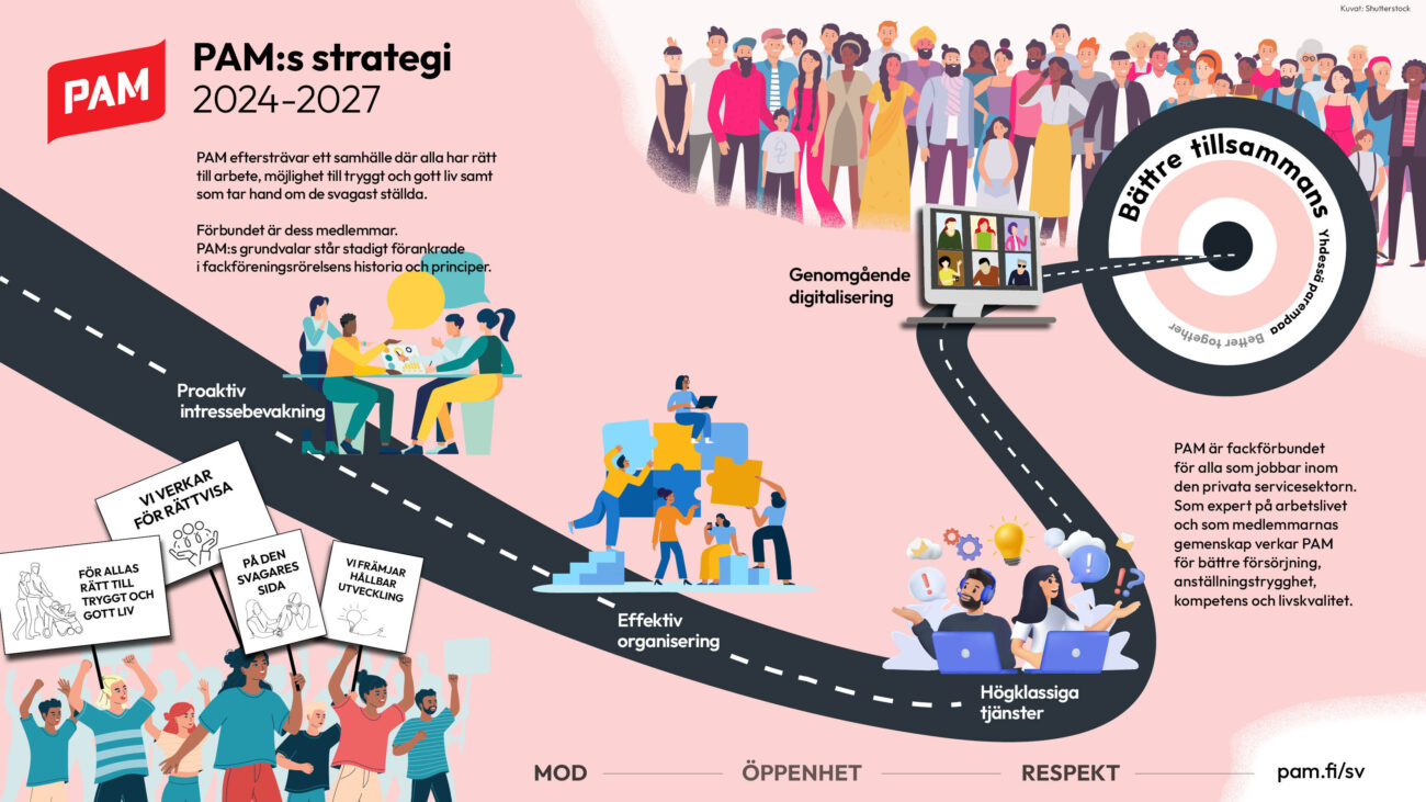 PAM i ett nötskal Servicefacket PAM rf är ett fackförbund för dem som arbetar inom privata servicebranscher. Vi har 190 000 medlemmar, varav två tredjedelar är kvinnor. De flesta av våra medlemmar arbetar inom detaljhandel, turism, restaurang- och fritidstjänster, fastighetstjänster och bevakningsbranschen. Vi förhandlar om kollektivavtal för servicebranscher. Vi förbättrar möjligheterna för arbetstagarna inom våra branscher att påverka arbetet, arbetsgemenskapen och säkerheten i arbetet samt utvecklingen av affärsverksamheten. Vi främjar demokrati, rättvisa, jämlikhet och social trygghet på nationell och internationell nivå. PAM bevakar sina medlemmars intressen Vi för samman och förenar anställda inom servicebranscher. Vi erbjuder medlemmarna stöd och trygghet i arbetslivet. Vi förhandlar om kollektivavtal för servicebranscherna och utövar tillsyn över hur de genomförs. Vi påverkar lagstiftningen om arbetslivet. Vi främjar förtroendevaldas verksamhet och intressebevakning på arbetsplatserna. PAM i siffror 180 000 medlemmar 71 % av medlemmarna är kvinnor 25 % är under 31 år 3 500 förtroendevalda 106 fackavdelningar 30 kollektivavtal PAMs verksamhet och målsättningar Målprogrammet för åren 2024-2027 (pdf) PAM:s förvaltning Förbundskongressen Förbundskongressen, som ordnas vart fjärde år, utövar den högsta beslutande makten i PAM. Förbundskongressen fastställer förbundets mål och godkänner verksamhetsprogrammet. Förbundskongressen väljer förbundets ordförande (samtidigt styrelsens ordförande) en personlig ersättare för styrelsens ordförande styrelsen och fullmäktige. Vid förbundskongressen fattas besluten av förbundsmedlemmar, som före mötet genom val valts ut som representanter till förbundskongressen. Vad händer under förbundskongressen? Förbundskongressen bedömer förbundets verksamhet samt drar upp riktlinjer och beslutar om den framtida verksamheten i form av ett målprogram. Den väljer personer till förbundets förvaltning och förtroendeuppdrag. Den behandlar dessutom de initiativ som fackavdelningarna har lämnat. Kongressrepresentanter väljs bland medlemskåren Vid förbundskongressen finns ett antal kongressrepresentanter enligt medlemsantalet: en representant per påbörjade 600 medlemmar i valkretsen. Kongressrepresentanterna väljs i förbundskongressvalet. Vid valen har alla medlemmar rösträtt och valbarhet, med undantag av studerande- och pensionärsmedlemmar eller förbundets funktionärer. Den senaste förbundskongressen ordnades i Jyväskylä 24–26.10.2023. Läs mera om förbundskongressen 2023 Förbundskongressens protokoll Förbundskongressen 2023 (på finska)Förbundskongressen 2019 (på finska) Fullmäktige Fullmäktige utövar beslutanderätt i PAM i de ärenden som inte enligt förbundets stadgar eller enligt lag ska avgöras av förbundskongressen eller styrelsen. Fullmäktige beslutar om förbundets medlemsavgift om verksamhetsplanen om budgeten om styrelsens ansvarsfrihet om ändring av förbundets stadgar. Mandattiden för fullmäktige är fyra år och fullmäktige sammanträder två gånger om året. Vårmötet hålls i maj–juni och höstmötet i november–december. Medlemmarna i fullmäktige väljs vid förbundskongressen. De representerar PAM-medlemmar från olika delar av Finland och olika yrkesgrupper. Fullmäktiges sammansättning Fullmäktige består av en ordförande, två vice ordförande, 50 medlemmar och 10 allmänna ersättare. Varje ordinarie fullmäktigeledamot har tre personliga ersättare. Medlemmarna har valts med beaktande av områden, yrkesgrupper och medlemskårens struktur. Fullmäktige 2023-2027 Fullmäktigeordförande: Sami ViitasaariFullmäktiges 1. vice ordförande: Christa PessiFullmäktiges 2. vice ordförande: Suvi Röntynen Alla medlemmar i fullmäktige (pdf) Motioner till PAM-fullmäktige Motionsrätt till fullmäktiges möten innehas av förbundens avdelningar, samfundsmedlemmarnaoch ledamöterna i fullmäktige. Motionsrätt innehas även av valbara personmedlemmar påförbundets avdelningar enligt 5 § 13 punkten, alltså alltid femtio (50) personmedlemmartillsammans enligt de närmare formbestämmelser som styrelsen fastställt. Motionerna ska lämnasin till styrelsen senast två (2) månader före mötet Motioner ska sändas vid motionsregistret Aloiterekisteri och där kan du bekanta dig med motioner som redan behandlats av fullmäktige. Vid behov kan du vara i kontakt med förvaltningssekreterare anu.valve@pam.fi. Styrelsen Styrelsen styr förbundets praktiska arbete. Den ansvarar för att de beslut som fattas av förbundskongressen framskrider och leder förbundets verksamhet. Styrelsen bland annat ser till att förbundets och fackavdelningarnas verksamhet överensstämmer med de riktlinjer som fastställts vid förbundskongressen samt att de är förenliga med gällande stadgar övervakar att förbundets ekonomi sköts enligt medlemmarnas intresse följer upp händelser på arbetsmarknaden och i samhället som berör förbundets medlemmar bereder förslag och ärenden som ska behandlas för förbundets fullmäktige. Styrelsen väljer verksamhetsledaren och förbundets anställda i chefsposition samt utser ledningsgruppen. Dessutom ansvarar den för genomförandet av förbundskongressvalet. Styrelsens mandatperiod är fyra år och styrelsens sammanträder i genomsnitt 11 gånger per år. Styrelsemedlemmar och val Styrelsemedlemmarna väljs av förbundskongressen. Styrelsen består av ordföranden (förbundets ordförande), ordförandens personliga ersättare, 15 medlemmar och tre allmänna ersättare. Om styrelsen måste kompletteras under förbundskongressperioden, fattas valet av fullmäktige. Medlemmarna i styrelsen deltar i fullmäktiges sammanträden och i planeringsdagarna för sitt område. En del av styrelsemedlemmarna är även medlemmar i branschkommittéer på sitt område. Styrelsen 2023-2027 Annika Rönni-Sällinen, ordförande