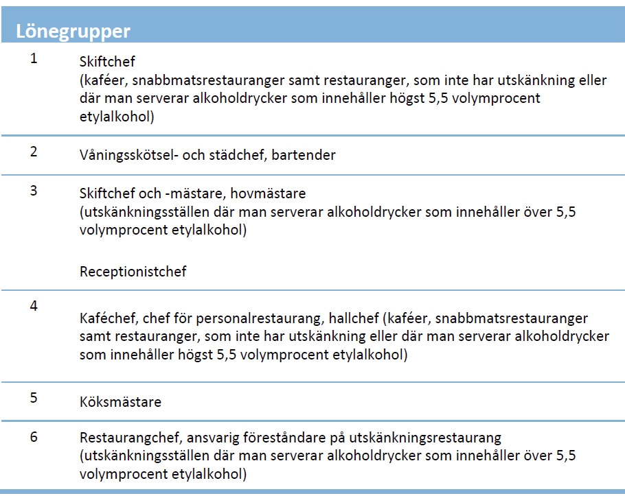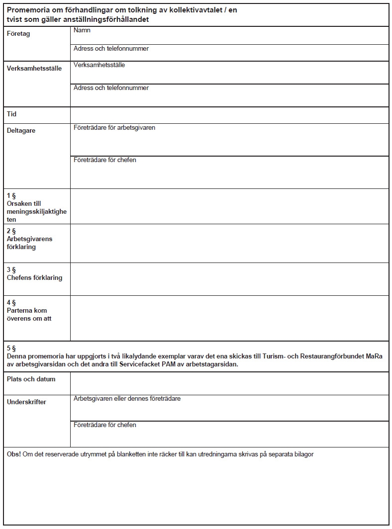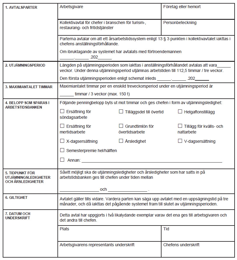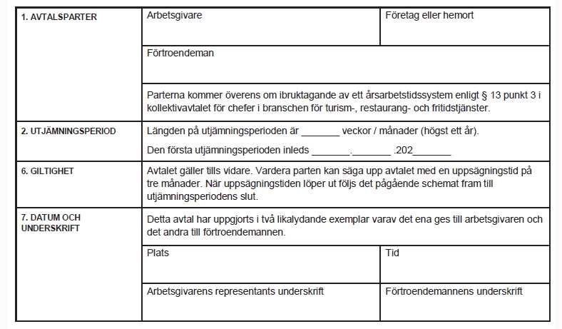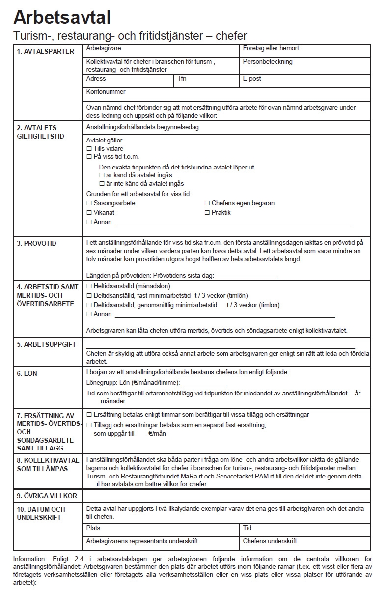 Framsida » Kollektivavtal för chefer inom turism-, restaurang- och fritidstjänster » Kollektivavtal för chefer i turism- och restaurangbranschen ← Tillbaka till innehållsförteckningen Kollektivavtal för chefer i turism- och restaurangbranschen Innehållsförteckning Open or close menu Tillbaka till innehållsförteckningen Kollektivavtal för chefer i turism- och restaurangbranschen 1. Tillämpningsområde§ 1 Avtalets omfattning2. Anställningsförhållande§ 2 Rätten att leda och fördela arbetet och organisationsrätt§ 3 Arbetsgivarens och chefens allmänna skyldigheter§ 4 Arbetsavtal och prövotid§ 5 Arbetsavtal som gäller tills vidare (ordinarie anställning) § 6 Arbetsavtal för viss tid 3. Arbetstid§ 7 Skyldighet att erbjuda mertidsarbete§ 8 Ordinarie arbetstid och arbetsdagens längd§ 9 Organisering av arbetstid§ 10 Arbetsskiftsförteckning§ 11 Särskilda helgdagar § 12 Årsledighetssystem (ÅL) § 13 Särskilda arbetstidsformer för heltidsanställda chefer4. Lön§ 14 Löneform§ 15 Fastställande av lönen§ 16 Faktorer som höjer lönen§ 17 Söndagsarbete och arbete som utförs på heldagar och helgaftnar§ 18 Mertids- och övertidsarbete § 19 Arbete som utförs på en ledig dag§ 20 Byte av förhöjd lön mot ledighet§ 21 Utbetalning av tillägg till lön som en särskild månadsersättning§ 22 Utbetalning av lön5. Frånvaro§ 23 Insjuknande§ 24 Läkarundersökningar§ 25 Tillfällig frånvaro§ 26 Familjeledigheter § 27 Lön för graviditets- och föräldraledighet§ 28 Semester§ 29 Semesterpremie7. Resor§ 30 Resekostnader § 31 Arbetsplatsvisa avtal9. Särskilda bestämmelser§ 32 Uppbörd av medlemsavgifter§ 33 Arbetsplatsmöten§ 34 a Förebyggande av våld § 34 b Främjande av välbefinnande i arbetet§ 34 c Indrivning av kassabrist§ 34 d Ställning för en person som introducerar andra i arbetet§ 35 Besök på arbetsplatsen§ 36 Grupplivförsäkring§ 37 Arbetsplatsmåltid§ 38 Arbetsdräkt10. Huvudförtroendeman, arbetarskyddsfullmäktig, förhandlingsordning och arbetsfred§ 39 Huvudförtroendeman och arbetarskyddsfullmäktig § 40 Förhandlingsordning§ 41 Arbetsfred och avtalsbrott11. Meddelande om avtalet och avtalets giltighetProtokoll för oförutsebara och exceptionella situationer Underteckningsprotokoll för förnyelse av kollektivavtalet för turism-, restaurang- och fritidstjänsterTurism-, restaurang- och fritidstjänster – chefernas löner ArbetsavtalAvtal om ibruktagande av en arbetstidsbankAvtal om arbetstidsbankModell för en promemoria och en meningsskiljaktighet Denna text är en översättning som nämnden för fastställande av kollektivavtals allmänt bindande verkan har låtit göra av ett finskspråkigt kollektivavtal. Kollektivavtalets parter har inte kommit överens om den svenskspråkiga kollektivavtalstexten. Om tolkningen av den svenskspråkiga översättningen leder till ett annat slutresultat än det ursprungliga finskspråkiga kollektivavtalet, ska man följa det finskspråkiga kollektivavtalet. Nämnden för fastställande av kollektivavtals allmänt bindande verkan är inte ansvarig för de skador som uppkommer på grund av eventuella felaktigheter i översättningen. Tämä on työehtosopimuksen yleissitovuuden vahvistamislautakunnan teettämä käännös suomenkielisestä työehtosopimuksesta. Työehtosopimuksen sopijaosapuolet eivät ole sopineet ruotsinkielisestä työehtosopimustekstistä. Mikäli ruotsinkielisen käännöksen tulkinta johtaa erilaiseen lopputulokseen kuin alkuperäinen suomenkielinen työehtosopimus, tulee noudattaa suomenkielistä työehtosopimusta. Työehtosopimuksen yleissitovuuden vahvistamislautakunta ei vastaa käännöksen mahdollisista virheellisyyksistä aiheutuvista vahingoista. 1. Tillämpningsområde§ 1 Avtalets omfattning Avtalet ska iakttas i inkvarterings- och restaurangbranschen samt i sådan verksamhet som är jämförbar med eller nära ansluten till branschen eller som stöder branschens verksamhet. Avtalet ska också iakttas i turism- och fritidstjänster som nämns nedan samt i välfärdstjänster i samband med de ovan nämnda. Avtalets tillämpningsområde omfattar typiskt: restauranger, caféer, pubar, nattklubbar cateringföretag och personalrestauranger halvfabrikatskök och beredningskök hotell och andra inkvarteringsföretag badanläggningar och välfärdscentra campingplatser och husvagnsområden semester- och stugbyar tjänster för landsbygdsturism service- och trafikstationer bowlinghallar semesteranläggningar och kurscentra kongresscentra främjande, försäljning, marknadsföring och förmedling av inhemska turismtjänster. Avtalet gäller chefer och av arbetsgivaren utsedda egentliga ansvariga föreståndare som underlyder arbetstidslagen, förutsatt att personen har som uppgift att leda eller övervaka arbetstagares arbete. Personer inom avtalets tillämpningsområde kan också tillfälligt delta i arbetet med sina underordnade. Avtalet tillämpas inte: på personer som har en självständig ledande ställning i företaget eller i en del av företaget, och inte heller på personer som i sin roll som arbetsgivarens företrädare har rätt att förhandla och besluta om arbetstagares löner och övriga arbetsvillkor. En förutsättning är att personen fortlöpande har självständig rätt att anställa och säga upp arbetstagare samt att lokalt förhandla och besluta om löne- och övriga arbetsvillkor i förhandlingar som enligt kollektivavtal förs med arbetstagare eller deras representanter. Om inget annat nämns för de ansvariga föreståndarnas del nedan, ska bestämmelserna om chefernas arbets- och lönevillkor tillämpas även på ansvariga föreståndare. Som en del av avtalet iakttas följande avtal: Allmänt avtal 1.10.2017 Förtroendemannaavtal 1.1.2021 Utbildningsavtal 1.1.2021 Rekommendation rörande förebyggande av missbruksproblem, handläggning av missbruksfrågor och vårdhänvisning på arbetsplatserna Avtal angående per