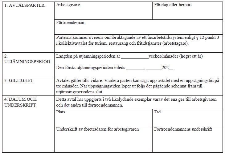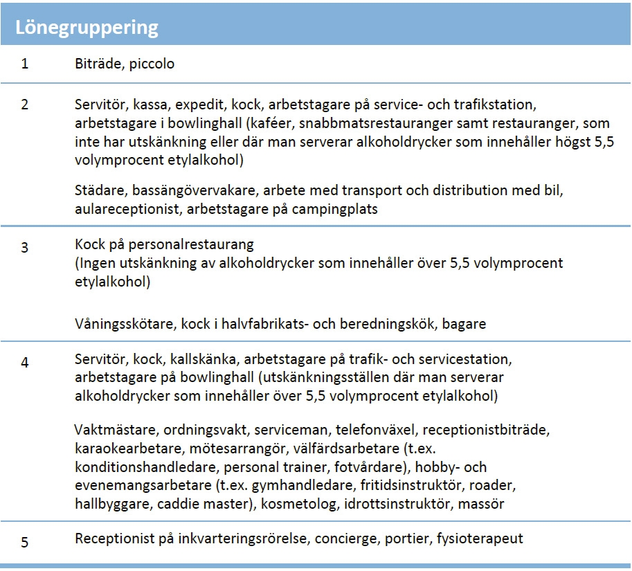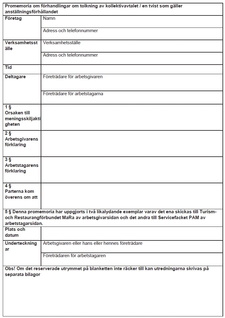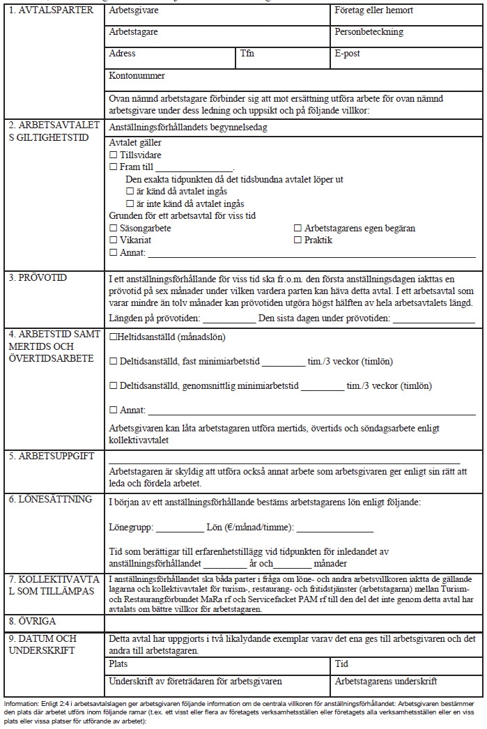 Framsida » Kollektivavtal för turism-, restaurang- och fritidsjtänster » Kollektivavtal för restaurangtjänster – arbetstagare ← Tillbaka till innehållsförteckningen Kollektivavtal för restaurangtjänster – arbetstagare Innehållsförteckning Open or close menu Tillbaka till innehållsförteckningen Kollektivavtal för restaurangtjänster – arbetstagare 1. Tillämpningsområde§ 1 Avtalets omfattning2. Arbetsförhållande§ 2 Direktionsrätt och organisationsrätt§ 3 Arbetsavtal och prövotid§ 4 Arbetsavtal som gäller tills vidare (ordinarie anställning)§ 5 Arbetsavtal på viss tid 2. Arbetstid§ 6 Skyldighet att erbjuda mera arbete § 7 Ordinarie arbetstid och arbetsdagens längd § 8 Organisering av arbetstid§ 9 Arbetsskiftsförteckning§ 10 Särskilda helgdagar § 11 Årsledighetssystem (ÅL) § 12 Särskilda arbetstidsformer för heltidsanställda arbetstagare 4. Lön§ 13 Löneform§ 14 Hur lönen fastställs§ 15 Lärlingar, unga arbetstagare och skolelever § 16 Faktorer som höjer lönen § 17 Söndagsarbete och arbete som utförs på heldagar och helgaftnar§ 18 Mer- och övertidsarbete§ 19 Arbete som utförs på en ledig dag§ 20 Byte av förhöjd lön mot ledighet§ 21 Betalning av lön 5. Frånvaro§ 22 Insjuknande § 23 Läkarkontroller § 24 Tillfällig frånvaro§ 25 Familjeledigheter § 26 Lön under graviditets- och föräldraledighet6. Semester § 27 Semester § 28 Semesterpremie 7. Resor§ 29 Resekostnader § 30 Lokala avtal9. Särskilda bestämmelser § 31 Uppbörd av medlemsavgifter§ 32 Arbetsplatsmöten§ 33 a Förebyggande av våld § 33 b Främjande av välbefinnande i arbetet§ 33 c Indrivning av kassabrist§ 33 d Den som håller i introduktionen i arbetets ställning§ 34 Besök på arbetsplatsen§ 35 Grupplivförsäkring§ 36 Arbetsplatsmåltid§ 37 Arbetsdräkt10. Bestämmelser om procentavlönade vaktmästare, ordningsvakter och portierer§ 38 Vaktmästare och ordningsvakter § 39 Portierer§ 40 Gemensamma bestämmelser för procentavlönade arbetstagare 11. Huvudförtroendeman, arbetarskyddsfullmäktig, förhandlingsordning och arbetsfred§ 41 Huvudförtroendeman och arbetarskyddsfullmäktig§ 42 Förhandlingsordning§ 43 Arbetsfred och avtalsbrott12. Meddelande om avtalet och avtalets giltighet Meddelande om avtalet Avtalets giltighet Protokoll över återinförd våningsstädningProtokoll över service-, trafik- och distributionsstationerProtokoll över arbetsvillkoren för kontorsanställdaProtokoll för oförutsebara och exceptionella situationerProtokoll för förnyande av kollektivavtalen för turism-, restaurang- och fritidstjänster Turism-, restaurang- och fritidstjänster – arbetstagares löner Månads- och timlöner 1.9.2025Månads- och timlöner 1.6.2026Månads- och timlöner 1.7.2027ArbetsavtalAvtal om ibruktagande av en arbetstidsbank Avtal om arbetstidsbank Mall för promemoria om en meningsskiljakstighet Denna text är en översättning som nämnden för fastställande av kollektivavtals allmänt bindande verkan har låtit göra av ett finskspråkigt kollektivavtal. Kollektivavtalets parter har inte kommit överens om den svenskspråkiga kollektivavtalstexten. Om tolkningen av den svenskspråkiga översättningen leder till ett annat slutresultat än det ursprungliga finskspråkiga kollektivavtalet, ska man följa det finskspråkiga kollektivavtalet. Nämnden för fastställande av kollektivavtals allmänt bindande verkan är inte ansvarig för de skador som uppkommer på grund av eventuella felaktigheter i översättningen. Tämä on työehtosopimuksen yleissitovuuden vahvistamislautakunnan teettämä käännös suomenkielisestä työehtosopimuksesta. Työehtosopimuksen sopijaosapuolet eivät ole sopineet ruotsinkielisestä työehtosopimustekstistä. Mikäli ruotsinkielisen käännöksen tulkinta johtaa erilaiseen lopputulokseen kuin alkuperäinen suomenkielinen työehtosopimus, tulee noudattaa suomenkielistä työehtosopimusta. Työehtosopimuksen yleissitovuuden vahvistamislautakunta ei vastaa käännöksen mahdollisista virheellisyyksistä aiheutuvista vahingoista. 1. Tillämpningsområde§ 1 Avtalets omfattning Avtalet ska iakttas i inkvarterings- och restaurangbranschen samt i sådan verksamhet som är jämförbar med eller nära ansluten till branschen eller som stöder branschens verksamhet. Avtalet ska också iakttas i turism- och fritidstjänster som nämns nedan samt i välfärdstjänster i samband med de ovan nämnda. Avtalets tillämpningsområde omfattar typiskt: restauranger, kaféer, pubar, nattklubbar cateringföretag och personalrestauranger halvfabrikatskök och beredningskök hotell och andra inkvarteringsföretag badanläggningar och välfärdscentra campingplatser och husvagnsområden semester- och stugbyar tjänster för landsbygdsturism service- och trafikstationer bowlinghallar semesteranläggningar och kurscenter kongresscenter främjande, försäljning, marknadsföring och förmedling av inhemska turismtjänster. Avtalet gäller arbetstagare som lyder under arbetstidslagen. Som en del av avtalet iakttas följande avtal: Allmänt avtal 1.10.2017 Förtroendemannaavtal 1.1.2021 Utbildningsavtal 1.1.2021 Rekommendation rörande förebyggande av missbruksproblem, handläggning av missbruksfrågor och vårdhänvisning på arbetsplatserna Avtal angående personalbespisning 1.10.2017 Strejkböter i enlighet med vad som stadgas i lagen om kollektivavtal 1.10.2017 Avtal om uppbörd av medlemsavgifter till fackföreningar 1.10.2017 Avtal om arbetarskyddssamarbete 1.1.2021 Avtal om samarbete 1.10.2017 Avtal om inlärning i arbetet 1.3.2018 2. Arbetsförhållande§ 2 Direktionsrätt och organisationsrätt Arbetsgivaren leder och fördelar arbetet. Arbetsgivaren anställer och säger upp arbetstagare. En arbetstagare som anställts för en viss arbetsuppgift är skyldig att vid behov utföra också annat liknande eller därmed jämförbart arbete då det inte i väsentlig grad ändrar hans egentliga arbet