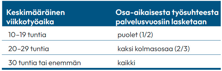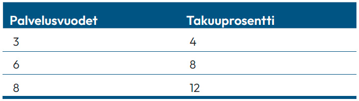 Etusivu » Työehtosopimukset » PAMin alojen työehtosopimukset » Apteekin työehtosopimus » Palkkausjärjestelmä 1.10.2026 alkaen ← Takaisin sisällysluetteloon Palkkausjärjestelmä 1.10.2026 alkaen Sisällysluettelo Open or close menu Takaisin sisällysluetteloon Palkkausjärjestelmä 1.10.2026 alkaen Vähimmäispalkat ja palkkausjärjestelmäPalkanmaksuKoululaispalkkaHarjoittelijan palkkaLääketeknikko-oppilaan (oppisopimusoppilas) palkkaPalvelusvuodet PalvelusvuositakuuTyökohtaisuuslisäHenkilökohtainen lisä Vähimmäispalkat ja palkkausjärjestelmä 1. Apteekkien työntekijöiden työehtosopimuksen mukainen työn vaativuuteen perustuva vähimmäispalkka muodostuu vaatimusryhmän mukaisesta palkasta ja palvelusvuositakuusta. Tehtävä työ kuuluu siihen vaativuusryhmään, joka kokonaisuutena parhaiten vastaa työtehtävän edellyttämää osaamista ja muuta tehtävän vaativuutta. 2. Vaatimusryhmittely ja vähimmäispalkat ovat tämän sopimuksen liitteenä. Palkanmaksu 3. Palkat maksetaan vähintään kerran kuukaudessa. Työaikalisät sekä sunnuntaityökorvaus on maksettava lisiin oikeuttavan työn tekemistä seuraavan kalenterikuukauden loppuun mennessä. Työsuhteen päättyessä loppupalkka voidaan maksaa työsuhteen päättymispäivän mukaisen palkanmaksukauden normaalina palkanmaksupäivänä. Työsuhteen purkutilanteessa sovelletaan 4 §:n 9 kohtaa. Koululaispalkka 4. Peruskoulun, lukion tai ammatillisen oppilaitoksen oppilaalle voidaan maksaa koululaispalkkaa. Koululaispalkka on 73 % I vaativuusryhmän vähimmäispalkasta. Koululaisen työskenneltyä tämän työehtosopimuksen tarkoittamassa ammatissa 3 kuukautta palkka määräytyy harjoittelijan palkan mukaan. Työsuhteen ei tarvitse olla yhdenjaksoinen. Harjoittelijan palkka 5. Harjoitteluaika työntekijällä on yksi vuosi, ellei lyhyemmästä harjoitteluajasta ole sovittu. Työsuhteen ei tarvitse olla yhdenjaksoinen. Harjoittelijan palkkamääräystä ei sovelleta, mikäli työntekijällä on tehtävän edellyttämä ammatillinen koulutus. Harjoitteluajan kesto lasketaan samalla tavalla kuten palvelusvuodet (10 § 7. kohta). Harjoittelijan palkka on 85 % sen vaativuusryhmän vähimmäispalkasta minkä mukaiseen vaativuusryhmään tehtävä harjoittelu on määritelty. Lääketeknikko-oppilaan (oppisopimusoppilas) palkka 6. Apteekissa tapahtuvan työnopetuksen ja työharjoittelun ajalta palkka määräytyy seuraavasti: palkka on 85 % II vaativuusryhmän vähimmäispalkasta. apteekissa jo työsuhteessa olevalle, jonka työsuhde on kestänyt vähintään 9 kuukautta ennen oppisopimussuhteen alkamista, maksetaan kuitenkin vähintään työaikaan suhteutettuna samaa palkkaa kuin mitä hänelle maksettiin ennen oppisopimussuhdetta. Palvelusvuodet 1. Palvelusvuosiin lasketaan työssäolokuukaudet ilman harjoitteluaikaa palkkaan oikeuttava poissaoloaika lakisääteisen raskaus- ja vanhempainvapaan ajalta enintään 160 raskaus- ja vanhempainvapaapäivää (hoitovapaata ja muuta palkatonta vapaata ei lasketa palvelusvuosiin). palvelusvuosiin lasketaan puolet alaan liittyvän oppisopimusohjelman kestosta tutkinnon tultua hyväksytysti suoritetuksi. Aiemman työkokemuksen osalta huomioidaan vastaavassa työtehtävässä työskennelty aika. Muussa työtehtävässä työskennelty aika voidaan ottaa huomioon kohtuullisessa määrin, jos työ vastaa tehtävässä vaadittavaa kokemusta. Työnantajan tulee tiedustella työntekijän aiempaa työkokemusta hyvissä ajoin ennen työsopimuksen tekemistä. Työntekijän tulee antaa hyväksyttävä selvitys työkokemuksestaan ennen työsopimuksen allekirjoittamista. Myöhemmin esitettävä selvitys ei oikeuta aikaisemman työkokemuksen huomioon ottamiseen. Osa-aikaisen palvelusvuodet kertyvät seuraavasti: Palvelusvuositakuu 8. Palvelusvuositakuu vaikuttaa työntekijän henkilökohtaiseen vähimmäispalkkaan. Yksittäisten työntekijöiden vaativuusryhmittelyn mukainen vähimmäispalkka korottuu ansaittujen palvelusvuosien myötä alla olevan taulukon perusteella: Palvelusvuositakuun mahdollisesti edellyttämä palkan muutos tehdään em. palveluvuosien täyttymistä seuraavaan kuukauden alusta. Esimerkki 1 Työntekijän tehtävä kuuluu vaativuusryhmään II ja hänen kokonaispalkkansa on 2100 euroa kuukaudessa. Kolme (3) palvelusvuotta tulee täyteen 12.3.2027. Kolmen (3) palvelusvuoden jälkeen hänen palvelusvuositakuunsa mukainen vähimmäispalkka tulee olemaan 2040 €/kk (vaativuusryhmän mukainen vähimmäispalkka) 4 prosentilla korotettuna eli 2121,60 €/kk. Palvelusvuositakuun johdosta työntekijälle maksetaan palkkaa 2121,60 €/kk 1.4.2027 eteenpäin. Esimerkki 2 Työntekijän tehtävä kuuluu vaativuusryhmään II ja hänen kokonaispalkkansa on 2150 euroa kuukaudessa. Kolme (3) palvelusvuotta tulee täyteen 12.3.2027. Kolmen (3) palvelusvuoden jälkeen hänen palvelusvuositakuunsa mukainen vähimmäispalkka tulee olemaan 2040 €/kk (vaativuusryhmän mukainen vähimmäispalkka) 4 prosentilla korotettuna eli 2121,60 €/kk. Työntekijän kokonaispalkka ylittää vaativuusryhmän ja palvelusvuositakuun mukaisen vähimmäispalkan, joten hänen palkkaansa ei tarvitse tehdä palvelusvuositakuusta johtuen muutoksia. Työkohtaisuuslisä 9. Työntekijän tehtävän vaativuusryhmä määritellään työsuhteen alkaessa sekä aina, kun työntekijän työtehtävät muuttuvat olennaisesti. Työtehtävä kuuluu siihen vaativuusryhmään, joka kokonaisuutena parhaiten vastaa työtehtävän edellyttämää osaamista ja muuta tehtävän vaativuutta. Työkohtaisuuslisää maksetaan työntekijän tehdessä omaa vaativuusryhmäänsä vaativampia tai monipuolisempia tehtäviä. Mikäli lisästä sovitaan, on suositeltavaa, että se tehdään kirjallisesti. Henkilökohtainen lisä 10. Henkilökohtaista lisää suositellaan maksettavaksi työntekijän työtaidon, työtehon tai kokemuksen poiketessa kyseisen työntekijäryhmän yleisestä keskitasosta. Poikkeavana työtaitona pidetään 