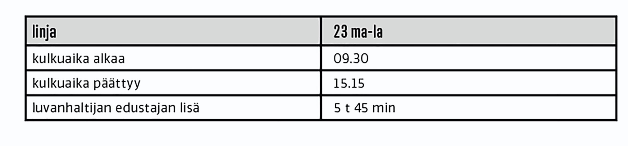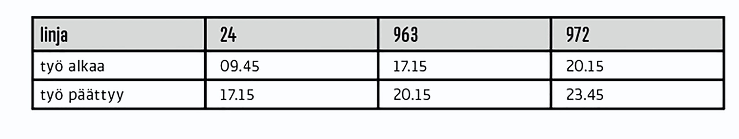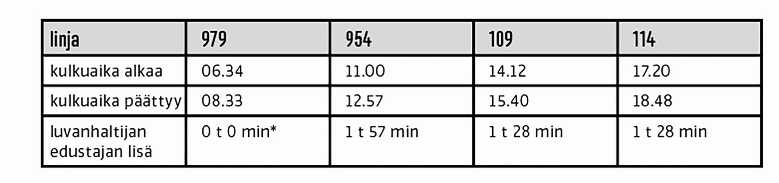 Etusivu » Työehtosopimukset » PAMin alojen työehtosopimukset » Avecran junapalveluhenkilökunnan työehtosopimus » Esimerkkejä luvanhaltijan edustajan lisän maksamisesta ← Takaisin sisällysluetteloon Esimerkkejä luvanhaltijan edustajan lisän maksamisesta Sisällysluettelo Open or close menu Takaisin sisällysluetteloon Esimerkkejä luvanhaltijan edustajan lisän maksamisesta Esimerkkivuoro 979 - 954 - 109 -114Esimerkkivuoro 24 - 963 - 972Esimerkkivuoro 23 Esimerkkivuoro 979 – 954 – 109 -114 Junavuorojen työaika kohdistetaan sille junalinjalle, jolla työ tehdään. Työaika yhteensä 06.15 – 19.15 = 13 t. Työvuoron aikana työntekijä toimii kaikissa junissa luvanhaltijan edustajana. Työaika on junalinjoittain jaoteltuna: Anniskelu tapahtuu sinä aikana, kun junassa on matkustajia. Luvanhaltijan edustajan lisä maksetaan junan kulkuajalta: *anniskelu aloitetaan klo 09.00 Luvanhaltijan edustajan lisä maksetaan yhteensä 4 tunnilta 53 minuutilta. Lisäksi vuorolta maksetaan: iltalisä 1 tunnilta 15 minuutilta (18.00 -19.15) matkaraha 13 tunnilta (06.15-19.15), koska vuoro tehdään saman vuorokauden aikana, jolloin työaika on sama kuin matkaraha-aika. V-päivänä, sunnuntaina, muuna kirkollisena juhlapyhänä, vapunpäivänä ja itsenäisyyspäivänä iltalisä, yölisä ja luvanhaltijan edustajan lisä maksetaan 100 %:lla korotettuna. Esimerkkivuoro 24 – 963 – 972 (vuoro sijoittuu kahdelle vuorokaudelle) PÄIVÄ 1 Junavuorojen työaika kohdistetaan sille junalinjalle, jolla työ tehdään. Työaika yhteensä 09.45 – 23.45 = 14 t. Työvuoron aikana työntekijä ei toimi kaikissa junissa luvanhaltijan edustajana. Työaika on junalinjoittain jaoteltuna: Anniskelu tapahtuu sinä aikana, kun junassa on matkustajia. Luvanhaltijan edustajan isä maksetaan junan kulkuajalta: * ma-la-vuoro ajetaan välillä Oulu-Helsinki, työntekijä ei toimi luvanhaltijan edustajana. ** su-vuoro ajetaan välillä Rovaniemi-Helsinki, työntekijä toimii luvanhaltijan edustajana. Luvanhaltijan edustajan lisä maksetaan yhteensä maanantai-lauantaivuoroilta 4 tunnilta 21 minuutilta ja sunnuntaivuoroilta 11 tunnilta 23 minuutilta. Lisäksi vuorolta maksetaan: ltalisä 5> <> > tunnilta 45 minuutilta (18.00 -23.45) <strong>matkaraha 17 tunnilta (09.45-03.00), koska vuoroon sisältyy yöpyminen toisella paikkakunnalla. Esimerkkivuoro 23 (vuoro sijoittuu kahdelle vuorokaudelle) PÄIVÄ 2 Junavuorojen työaika kohdistetaan sille junalinjalle, jolla työ tehdään. Työaika yhteensä 08.30 – 15.30 = 7 t. Työtä tehdään vain yhdellä junalinjalla: Anniskelu tapahtuu sinä aikana, kun junassa on matkustajia. Luvanhaltijan edustajan lisä maksetaan junan kulkuajalta: Luvanhaltijan edustajan lisä maksetaan yhteensä 5 tunnilta 45 minuutilta. Lisäksi vuorolta maksetaan: matkaraha 12 tunnilta 30 minuutilta (03.00-15.30), koska vuoroon sisältyy yöpyminen toisella paikkakunnalla. V-päivänä, sunnuntaina, muuna kirkollisena juhlapyhänä, vapunpäivänä ja itsenäisyyspäivänä iltalisä, yölisä ja luvanhaltijan edustajan lisä maksetaan 100 %:lla korotettuna. ← Takaisin sisällysluetteloon