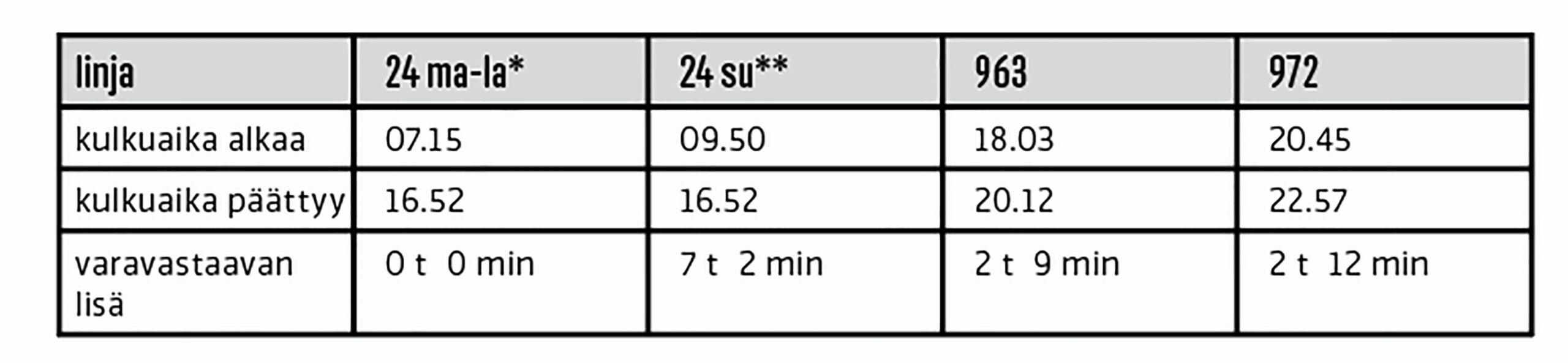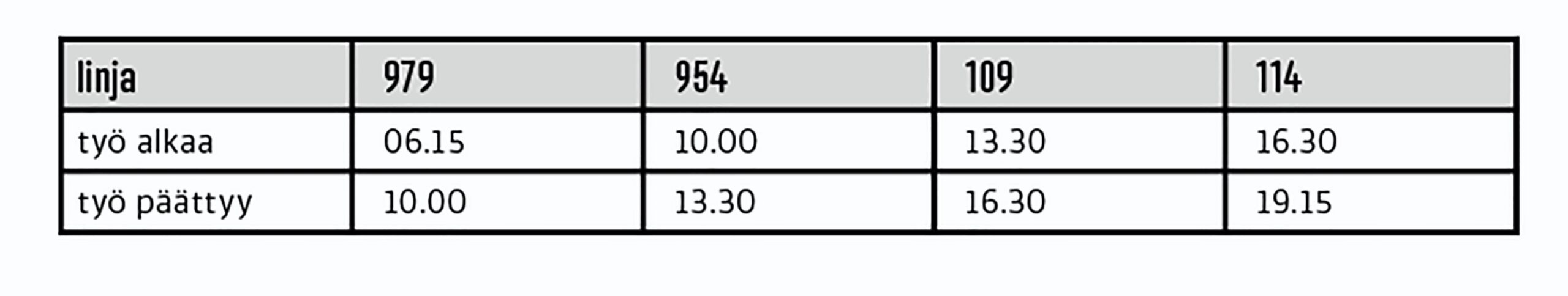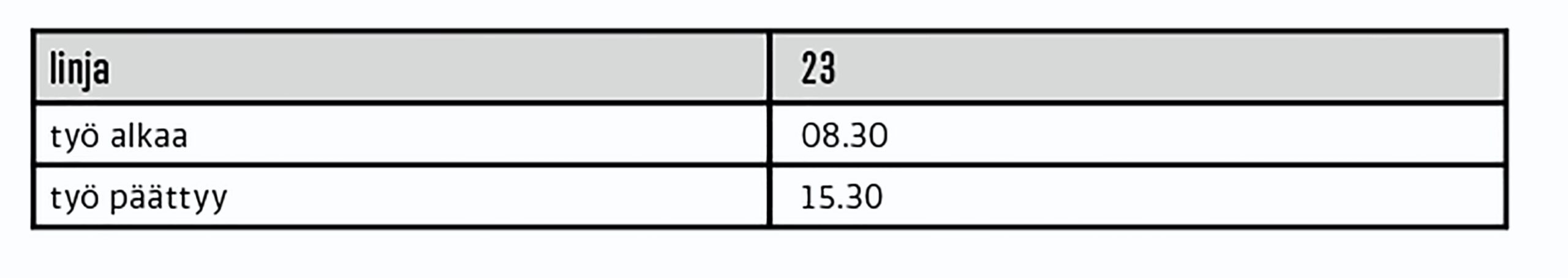 Etusivu » Työehtosopimukset » PAMin alojen työehtosopimukset » Avecran junapalveluhenkilökunnan työehtosopimus » Esimerkkejä luvanhaltijan edustajan lisän maksamisesta ← Takaisin sisällysluetteloon Esimerkkejä luvanhaltijan edustajan lisän maksamisesta Sisällysluettelo Open or close menu Takaisin sisällysluetteloon Esimerkkejä luvanhaltijan edustajan lisän maksamisesta Esimerkkivuoro 979 - 954 - 109 -114Esimerkkivuoro 24 - 963 - 972Esimerkkivuoro 23 Esimerkkivuoro 979 – 954 – 109 -114 Junavuorojen työaika kohdistetaan sille junalinjalle, jolla työ tehdään. Työaika yhteensä 06.15 – 19.15 = 13 t. Työvuoron aikana työntekijä toimii kaikissa junissa luvanhaltijan edustajana. Työaika on junalinjoittain jaoteltuna: Anniskelu tapahtuu sinä aikana, kun junassa on matkustajia. Luvanhaltijan edustajan lisä maksetaan junan kulkuajalta: *anniskelu aloitetaan klo 09.00 Luvanhaltijan edustajan lisä maksetaan yhteensä 4 tunnilta 53 minuutilta. Lisäksi vuorolta maksetaan: iltalisä 1 tunnilta 15 minuutilta (18.00 -19.15) matkaraha 13 tunnilta (06.15-19.15), koska vuoro tehdään saman vuorokauden aikana, jolloin työaika on sama kuin matkaraha-aika. V-päivänä, sunnuntaina, muuna kirkollisena juhlapyhänä, vapunpäivänä ja itsenäisyyspäivänä iltalisä, yölisä ja luvanhaltijan edustajan lisä maksetaan 100 %:lla korotettuna. Esimerkkivuoro 24 – 963 – 972 (vuoro sijoittuu kahdelle vuorokaudelle) PÄIVÄ 1 Junavuorojen työaika kohdistetaan sille junalinjalle, jolla työ tehdään. Työaika yhteensä 09.45 – 23.45 = 14 t. Työvuoron aikana työntekijä ei toimi kaikissa junissa luvanhaltijan edustajana. Työaika on junalinjoittain jaoteltuna: Anniskelu tapahtuu sinä aikana, kun junassa on matkustajia. Luvanhaltijan edustajan isä maksetaan junan kulkuajalta: * ma-la-vuoro ajetaan välillä Oulu-Helsinki, työntekijä ei toimi luvanhaltijan edustajana. ** su-vuoro ajetaan välillä Rovaniemi-Helsinki, työntekijä toimii luvanhaltijan edustajana. Luvanhaltijan edustajan lisä maksetaan yhteensä maanantai-lauantaivuoroilta 4 tunnilta 21 minuutilta ja sunnuntaivuoroilta 11 tunnilta 23 minuutilta. Lisäksi vuorolta maksetaan: ltalisä 5> <> > tunnilta 45 minuutilta (18.00 -23.45) <strong>matkaraha 17 tunnilta (09.45-03.00), koska vuoroon sisältyy yöpyminen toisella paikkakunnalla. Esimerkkivuoro 23 (vuoro sijoittuu kahdelle vuorokaudelle) PÄIVÄ 2 Junavuorojen työaika kohdistetaan sille junalinjalle, jolla työ tehdään. Työaika yhteensä 08.30 – 15.30 = 7 t. Työtä tehdään vain yhdellä junalinjalla: Anniskelu tapahtuu sinä aikana, kun junassa on matkustajia. Luvanhaltijan edustajan lisä maksetaan junan kulkuajalta: Luvanhaltijan edustajan lisä maksetaan yhteensä 5 tunnilta 45 minuutilta. Lisäksi vuorolta maksetaan: matkaraha 12 tunnilta 30 minuutilta (03.00-15.30), koska vuoroon sisältyy yöpyminen toisella paikkakunnalla. V-päivänä, sunnuntaina, muuna kirkollisena juhlapyhänä, vapunpäivänä ja itsenäisyyspäivänä iltalisä, yölisä ja luvanhaltijan edustajan lisä maksetaan 100 %:lla korotettuna. ← Takaisin sisällysluetteloon