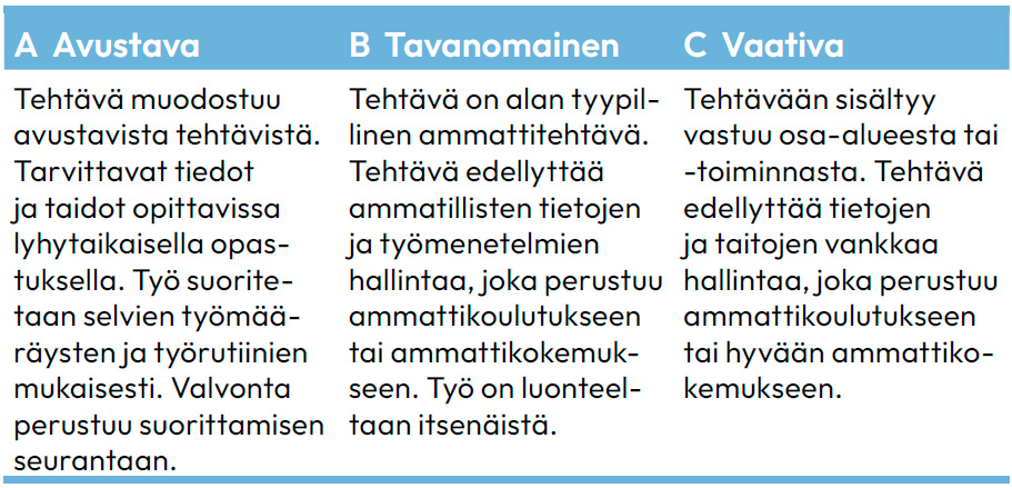 Etusivu » Työehtosopimukset » PAMin alojen työehtosopimukset » Hiihtokeskusalan työehtosopimus » Hiihtokeskustyöntekijöiden vaativuusryhmittely ← Takaisin sisällysluetteloon Hiihtokeskustyöntekijöiden vaativuusryhmittely Esihenkilöiden vähimmäispalkka on 10 % korkeampi kuin C-palkkaryhmän ao. vähimmäispalkka. ← Takaisin sisällysluetteloon