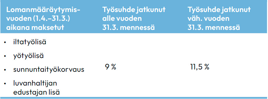 Etusivu » Työehtosopimukset » PAMin alojen työehtosopimukset » Huvi-, teema- ja elämyspuistoja koskeva työehtosopimus » 12 § Vuosilomapalkka, lomaltapaluuraha ja lomakorvaus ← Takaisin sisällysluetteloon 12 § Vuosilomapalkka, lomaltapaluuraha ja lomakorvaus Sisällysluettelo Open or close menu Takaisin sisällysluetteloon 12 § Vuosilomapalkka, lomaltapaluuraha ja lomakorvaus 1. VuosilomapalkkaI. Kuukausipalkkaiset työntekijätII. Tuntipalkkaiset työntekijätIII. Lomapalkka muutostilanteissa2. Lomaltapaluuraha1. Maksamisedellytykset2. Suuruus3. Vuosilomapalkan ja lomaltapaluurahan maksaminen4. Vuosilomakorvaus1. Vuosilomakorvaus työsuhteen kestäessä2. Vuosilomakorvaus työsuhteen päättyessä 1. VuosilomapalkkaI. Kuukausipalkkaiset työntekijät Kuukausipalkkaisen työntekijän loma-ajan päiväpalkka saadaan jakamalla lomalle lähtiessä voimassa oleva kuukausipalkka luvulla 25. Päiväpalkka kerrotaan ansaittujen lomapäivien määrällä. Peruskuukausipalkan pohjalta laskettu vuosilomapalkka tasataan seuraavana palkanmaksupäivänä. Kuukausipalkkaisen työntekijän lomapalkkaan lisätään lomanmääräytymisvuoden aikana maksettujen iltatyö-, yötyö-, ja luvanhaltijan edustajan lisien sekä sunnuntaityökorvausten summasta: II. Tuntipalkkaiset työntekijät Lomapalkka on lomanmääräytymisvuoden (1.4. – 31.3.) ansiosta: 9 % työsuhteen jatkuttua lomanmääräytymisvuoden loppuun mennessä alle vuoden 11,5 % työsuhteen jatkuttua lomanmääräytymisvuoden loppuun mennessä vähintään vuoden. Lomapalkka lasketaan prosentuaalisesti lomanmääräytymisvuoden ansiosta, joka muodostuu: a. työssäolon ajalta maksetusta palkasta (lukuun ottamatta yli- ja hätätyöstä maksettua korotusosaa) sekä b. seuraavista vuosilomaa kerryttävien poissaolojen ajalta laskettavista laskennallisista palkkaeristä: sairausajalta maksetun palkan lisäksi yhteensä enintään 75 työpäivältä lääkinnällisen kuntoutuksen ajalta, kun sellaista annetaan lääkärin määräyksestä ammattitaudin tai tapaturman johdosta työkyvyn palauttamiseksi tai säilyttämiseksi, yhteensä enintään 75 työpäivältä ajalta, jonka työ on estynyt sairauden leviämisen estämiseksi annetun viranomaisen määräyksen takia erityisraskaus-, raskaus- ja vanhempainvapaalta vuosilomalaissa tarkemmin määritellyltä ajanjaksolta sekä tilapäisen hoitovapaan ja pakottavista perhesyistä johtuvan poissaolon ajalta lomautusajalta enintään 30 työpäivältä lomautusta kohden työehtosopimuksen mukaisen tilapäisen poissaolon ja lääkärintarkastuksen ajalta. Alle 14 päivää, mutta vähintään 35 tuntia kuukaudessa työskentelevän työntekijän osalta laskennallista palkkaa lisätään sairaus- tai kuntoutusajalta jo maksetun palkan lisäksi yhteensä enintään 105 kalenteripäivän ajalta lomanmääräytymisvuodessa ja lomautusajalta enintään 42 kalenteripäivän ajalta kerrallaan. Laskennallinen palkka määräytyy poissaolon alkamishetken tuntipalkan ja sovitun keskimääräisen kolmiviikkoistuntimäärän perusteella tai sen puuttuessa poissaolon alkamishetkeä edeltävän kolmen täyden kolmiviikkoisjakson toteutuneen työajan perusteella (kaksiviikkoisjärjestelmää käytettäessä neljän kaksiviikkoisjakson perusteella). Huomioon otetaan myös poissaoloaikana tapahtuneet palkankorotukset. III. Lomapalkka muutostilanteissa Lomapalkka lasketaan prosentuaalisesti II-kohdan mukaisesti myös silloin, kun työntekijän työaika ja palkkausmuoto (tuntipalkasta kuukausipalkaksi tai toisin päin) ovat muuttuneet lomanmääräytymisvuoden aikana. Lomapalkan tasausta ei tällöin suoriteta. Tätä laskentatapaa ei kuitenkaan sovelleta työntekijän ollessa osittain lomautettuna. 2. Lomaltapaluuraha1. Maksamisedellytykset Työntekijä on oikeutettu lomaltapaluurahaan: aloittaessaan loman ilmoitettuna tai sovittuna aikana ja palattuaan työhön heti loman päätyttyä sekä lomapalkasta ja lomakorvauksesta siirtyessään vanhuus-, työkyvyttömyys-, yksilölliselle varhais- tai varhennetulle vanhuuseläkkeelle. Työhön palaamiseen rinnastetaan poissaolo, joka johtuu vuosilomalain 7 §:ssä mainitusta syystä työnantajan suostumuksesta erityisraskaus-, raskaus- ja vanhempainvapaasta ylivoimaisesta esteestä (julkinen kulkuneuvo rikkoontunut) työpaikan muiden työntekijöiden vuosilomista reservin harjoituksista tai ylimääräisestä palveluksesta sairaudesta tai tapaturmasta kunnallisesta luottamustehtävästä, josta ei ole lain mukaan oikeutta kieltäytyä viranomaisen sairauden leviämisen estämiseksi antamasta määräyksestä muusta syystä, jos työnantaja lain tai työehtosopimuksen mukaan poissaolosta huolimatta on ollut velvollinen maksamaan työntekijälle tällaiselta päivältä palkkaa lomauttamisesta voimassa olevan oppisopimuksen edellyttämään tietopuoliseen koulutukseen osallistumisesta koulutussopimuksen mukaisesta poissaolosta. Riittävää on, jos edellä lueteltu syy on ollut olemassa sinä päivänä, joka olisi ollut lomaltapaluupäivä. Loman päättymishetkellä opintovapaalla, vuorotteluvapaalla tai hoitovapaalla olevalle työntekijälle lomaltapaluuraha maksetaan hänen palattuaan työhön lain tarkoittaman ennakkoilmoituksen tai siihen myöhemmin lain mukaisin perustein tehdyn muutoksen taikka työnantajan kanssa tehdyn sopimuksen mukaisesti. Asepalvelusta, vapaaehtoista asepalvelusta tai siviilipalvelusta suorittamasta palanneelle lomaltapaluuraha suoritetaan siitä vuosilomapalkasta ja/tai vuosilomakorvauksesta, joka hänelle maksettiin palvelukseen lähtiessään. Mikäli muusta kuin työntekijästä johtuvasta syystä irtisanotun työntekijän työsopimus päättyy vuosiloman aikana ja työntekijä on tästä syystä estynyt palaamasta vuosilomaltaan työhön, on työntekijällä oikeus lomaltapaluurahaan pidetyn tai pidetyksi sovitun vuosiloman osalta. 2. Suuruus Lomaltapaluuraha on 50 % työehtosopimuksen mukaan lasketusta lomapalkasta. Lomaltapaluurah