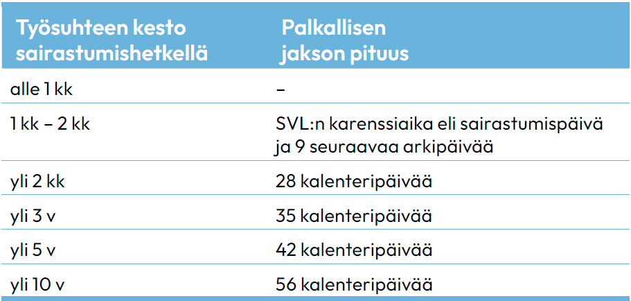 Etusivu » Työehtosopimukset » PAMin alojen työehtosopimukset » Huvi-, teema- ja elämyspuistoja koskeva työehtosopimus » 13 § Sairausajan palkka ← Takaisin sisällysluetteloon 13 § Sairausajan palkka Sisällysluettelo Open or close menu Takaisin sisällysluetteloon 13 § Sairausajan palkka 1. Palkanmaksun edellytykset2. Ilmoitusvelvollisuus ja selvitys työkyvyttömyydestä2 a Sairauspoissaoloista ilmoittaminen paikallisesti sopien2 b 2 c3. Sairausajan palkkajaksot4. Sairausajan palkan määräKuukausipalkkaiset työntekijätTuntipalkkaiset työntekijät5. Sairausajan palkan maksutapa6. Sairauden uusiutuminen 1. Palkanmaksun edellytykset Työnantaja maksaa sairausajan palkkaa, jos: työntekijän työsuhde on kestänyt vähintään kuukauden ja työntekijä on sairauden tai tapaturman johdosta estynyt tekemästä työtä ja työntekijä ei ole aiheuttanut työkyvyttömyyttään tahallisesti tai törkeällä tuottamuksella tai työntekijä on määrätty tartuntatautilain mukaiseen karanteeniin. 2. Ilmoitusvelvollisuus ja selvitys työkyvyttömyydestä Työntekijä on velvollinen viipymättä henkilökohtaisesti ilmoittamaan sairastumisestaan työnantajalle tai tämän edustajalle. Henkilökohtainen ilmoitus tulee tehdä työnantajan ohjeistamalla tavalla. Työntekijän laiminlyödessä välittömän ilmoituksen tahallaan tai huolimattomuudesta palkanmaksuvelvollisuus alkaa ilmoittamisesta. Työkyvyttömyydestä on vaadittaessa esitettävä lääkärintodistus tai muu työnantajan hyväksymä selvitys. Jos työnantaja nimeää käytettävän lääkärin, vastaa työnantaja lääkärintodistuksen hankkimiskustannuksista. Enintään kolme kalenteripäivää kestävän sairaustapauksen osalta selvitys voidaan esittää myös työterveyshoitajan, terveydenhoitajan tai sairaanhoitajan antamalla todistuksella edellyttäen, että kysymyksessä on epidemialuontoinen sairaus (esim. flunssa tai vatsatauti) ja työnantaja ei ole järjestänyt lääkäripalvelut sisältävää työterveyshuoltoa ja työntekijä ei ole pyynnöstään huolimatta saanut vastaanottoaikaa julkisen terveydenhuollon piiriin kuuluvalta lääkäriltä hoidon kiireellisyysluokituksen tai muun pakottavan syyn vuoksi. Sairauden jatkuessa tai uusiutuessa 30 päivän kuluessa edellisen työkyvyttömyysjakson päättymisestä tulee kuitenkin vaadittaessa esittää lääkärintodistus. 2 a Sairauspoissaoloista ilmoittaminen paikallisesti sopien Paikallisesti TES 22 § mukaisesti voidaan sopia menettelystä, jossa työntekijällä on mahdollisuus ilmoittaa lyhytaikaisesta työkyvyttömyydestään ja sen syystä työnantajalle ilman työkyvyttömyyden todentavaa lääkärin tai terveydenhoitajan todistusta. Tällainen työpaikkakohtainen sopimus voi koskea enintään kolme kalenteripäivää kestäviä työntekijän omia sairauspoissaoloja ja vain lyhytkestoisia sairauksia, jotka eivät vaadi lääkärinhoitoa (esim. flunssa, vatsatauti). Työkyvyttömyydestä tulee ilmoittaa viipymättä TES 13 § 2. kohdan mukaisesti. Työnantaja voi velvoittaa työntekijää toimittamaan lääkärintodistuksen jo ensimmäisestä päivästä lukien, mikäli katsoo sen perustellusta syystä tarpeelliseksi. Tällainen syy voi liittyä esimerkiksi toistuviin lyhyihin sairauspoissaoloihin, tapahtumainkulkuun työpaikalla ennen poissaoloa tai epäilyyn päihteiden väärinkäytöstä. Menettelystä sovittaessa voidaan ottaa huomioon mm. seuraavaa: sopimuksen tavoitteet keitä menettely koskee: esim. menettely ei koske hoitoonohjaustoimenpiteiden piirissä olevia tai työntekijöitä, joilla on aikaisemmin todettu työkykyongelmia miten ja kenelle ilmoitus tehdään kuinka pitkäksi aikaa poissaolo-oikeus myönnetään kerrallaan menettelyn voimassaolo koeaikana menettelyn noudattaminen sairauspoissaolon ajoittuessa vapaapäivien tai lomien yhteyteen väärinkäytösten ennakointi ja mahdollisuus poistaa työntekijä menettelyn piiristä tai poiketa sairausajan palkanmaksuperusteista väärinkäytöstapauksessa kuinka toimitaan sairauden jatkuessa kuinka monta kertaa vuodessa voi olla poissa tällä menettelyllä lääkärin määräämää poissaoloa ei jatketa tällä menettelyllä miten sopimuksen toteutumista seurataan. 2 b Työntekijän on työnantajan vaatimuksesta suostuttava muulloinkin lääkärintarkastukseen työnantajan oman tai osoittaman lääkärin luona, jolloin työnantaja korvaa lääkärintodistuksen hankkimiskustannukset. 2 c Sairauslomalla olevan työntekijän tulee noudattaa annettuja hoito-ohjeita sekä huolehtia siitä, ettei hän menettelyllään viivästytä työkykynsä palautumista. 3. Sairausajan palkkajaksot Sairausajan palkkaa maksetaan työsuhteen kestoajan perusteella seuraavasti: Jos työntekijä on työtehtävissä tapahtuneen työtapaturman vuoksi kykenemätön suorittamaan työtään, maksetaan hänelle edellä olevasta taulukosta poiketen työkyvyttömyyden aiheuttaman poissaolon ajalta sairausajan palkkaa jäljempänä mainittujen määräysten mukaisesti vähintään neljän viikon pituiselta ajanjaksolta (28 kalenteripäivää) työsuhteen kestoajasta riippumatta. Tältä ajalta työntekijälle lain mukaan kuuluva päiväraha maksetaan työnantajalle enintään työnantajan maksamaa palkan määrää vastaavasti. 4. Sairausajan palkan määrä Kuukausipalkkaiset työntekijät Kuukausipalkkaiselle työntekijälle maksetaan peruskuukausipalkkaa palkalliselta sairausajanjaksolta. Sairausajan palkanmaksun keskeytyessä tai katketessa lasketaan osakuukauden palkka työehtosopimuksen 10 § 4. kohdan mukaisesti. Tuntipalkkaiset työntekijät Tuntipalkkaiselle työntekijälle maksetaan perustuntipalkka työvuorolistaan merkityiltä työtunneilta. Ellei sairausajalle ole laadittu työvuorolistaa, maksetaan palkka poissaoloa edeltävän kolmen täyden kolmiviikkoisjakson toteutuneen työajan perusteella. Kaksiviikkoisjärjestelmää käytettäessä laskentaperusteena pidetään poissaoloa edeltävää neljää täy