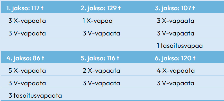 Etusivu » Työehtosopimukset » PAMin alojen työehtosopimukset » Huvi-, teema- ja elämyspuistoja koskeva työehtosopimus » 5 a § Kokoaikatyöntekijän työajan tasoittumisjärjestelmä ← Takaisin sisällysluetteloon 5 a § Kokoaikatyöntekijän työajan tasoittumisjärjestelmä Sisällysluettelo Open or close menu Takaisin sisällysluetteloon 5 a § Kokoaikatyöntekijän työajan tasoittumisjärjestelmä 1. Säännöllinen työaika ja tasoittumiskausi2. Poissaolojen vaikutus3. Lisä- ja ylityö kaksi- tai kolmiviikkoisjaksolla4. Työsuhteen päättyminen kesken tasoittumiskauden5. Tasoittumiskauden päättyminen 1. Säännöllinen työaika ja tasoittumiskausi Kuukausipalkkaisissa työaikamuodoissa säännöllinen työaika voidaan järjestää 112,5 tunniksi siten, että työaika tasoitetaan edellä mainittuun määrään enintään kuuden (6) peräkkäisen kolmiviikkoisjakson (tasoittumiskausi). Yksittäisen kolmiviikkoisjakson säännöllinen työaika saa olla enintään 129 tuntia. Kaksiviikkoisjärjestelmää käytettäessä työaika järjestetään 75 tunniksi enintään yhdeksän (9) peräkkäisen kaksiviikkoisjakson aikana ja yksittäisen kaksiviikkoisjakson säännöllinen työaika saa olla enintään 86 tuntia. Noudatettavan tasoittumiskauden pituus sekä sen alkamis- ja päättymisajankohta tulee käydä ilmi työvuorolistasta. Viikkolepopäivä (V) on annettava jokaisella työssäoloviikolla. Kustakin kolmiviikkoisjaksosta voidaan siirtää enintään kaksi (2) X-päivää ja kaksiviikkoisjaksosta yksi (1) X-päivä tasoittumiskauden sisällä muuna ajankohtana annettavaksi, jolloin siirretty X -päivä annetaan muuhun vapaaseen yhdistäen. Siirretty X -päivä rinnastetaan työpäivään X-, V- ja AP-vapaita sekä vuosilomaa ansaittaessa. Vapaapäivien välissä saa olla enintään seitsemän työpäivää. Työaika tasoitetaan joko päivittäistä työaikaa lyhentämällä tai antamalla erillisiä tasoitusvapaita tasoittumiskauden aikana. Tasoittumiskauden aikana tulee antaa kuitenkin vähintään 3 tasoitusvapaata. Tasoitusvapaat (TS) merkitään työvuorolistaan ja ne rinnastetaan työpäivään X-, V- ja AP-vapaita ja vuosilomaa ansaittaessa sekä maksettaessa osakuukauden palkkaa. Tasoitusvapaat eivät saa mennä vapaapäivien tai vuosiloman kanssa päällekkäin. Esimerkki 1. Työajan tasoittuminen Noudatettavan tasoittumiskauden pituus on 6 kolmiviikkoisjaksoa. Tasoittumiskauden työtuntimäärä on yhteensä 6 x 112,5 tuntia eli 675 tuntia. Tasoittumiskauden aikana on annettu yhteensä 4 tasoitusvapaata. 2. Poissaolojen vaikutus Poissaolon ajalta luetaan työaikajärjestelmään tehdyiksi työtunneiksi työvuorolistan mukaiset työtunnit. Mikäli työvuorolistaa ei ole laadittuna, luetaan järjestelmään tehdyksi työajaksi 7,5 tuntia työpäivää kohti ja 37,5 tuntia työviikkoa kohti. Vuosiloman ajalta luetaan tehdyksi työajaksi TES 11 § 4. kohdan mukainen vuosiloman työaikaa lyhentävä vaikutus ja AP-vapaan osalta 7,5 tuntia. 3. Lisä- ja ylityö kaksi- tai kolmiviikkoisjaksolla Lisä- ja ylityönä korvataan kolmiviikkoisjaksolla 129 tunnin jälkeen tehty työ seuraavasti: 7,5 tuntia lisätyönä yksinkertaisella tuntipalkalla 18 seuraavaa tuntia 50 %:lla ja seuraavat tunnit 100 %:lla korotetulla palkalla. Kaksiviikkoisjärjestelmää käytettäessä korvataan jaksolla 86 tunnin jälkeen tehty työ seuraavasti: 5 tuntia lisätyönä yksinkertaisella tuntipalkalla 12 seuraavaa tuntia 50 %:lla ja seuraavat tunnit 100 %:lla korotetulla palkalla. Jaksokohtaiseen lisä- tai ylityökorvaukseen oikeuttavaa aikaa ei oteta huomioon tasoittumiskauden kokonaistuntimäärää laskettaessa 4. Työsuhteen päättyminen kesken tasoittumiskauden Työsuhteen päättyessä kesken tasoittumiskauden työntekijästä johtuvasta syystä ennen kuin työaika on tasoittunut säännölliseen enimmäistyöaikaan voidaan työtuntien alijäämä vähentää työntekijän palkasta. Mahdollinen ylijäämä korvataan rahana yksinkertaisella tuntipalkalla. Mikäli työsuhteen päättyminen johtuu työnantajasta johtuvasta syystä, alijäämää ei vähennetä. Mahdollinen lisä- ja ylityö korvataan kolmiviikkoisjärjestelmässä keskimääräisen säännöllisen enimmäistyöajan ylittävistä työtunneista seuraavasti: keskimääräiseen 120 tuntiin asti lisätyönä yksinkertaisella tuntipalkalla seuraavilta tunneilta puolet 50 %:lla ja puolet 100 %:lla korotetulla palkalla. Kaksiviikkoisjärjestelmässä enimmäistyöajan ylittävät tunnit korvataan lisätyönä keskimääräiseen 80 tuntiin asti ja tämän ylittävältä määrältä ylityönä samoin periaattein. Esimerkki 2. Lisä- ja ylityö työsuhteen päättyessä kesken tasoittumiskauden 112,5 tunnin kokoaikatyöntekijän työsuhde päättyy kesken 18 viikon tasoittumiskauden työnantajasta johtuvasta syystä kolmen kolmiviikkoisjakson jälkeen. 1. jakso: 129 t 2. jakso: 128 t 3. jakso: 109 t Jaksojen yhteenlaskettu työtuntimäärä on 366 tuntia eli keskimäärin 122 tuntia kolmiviikkoisjaksossa. Lisätyötä on tällöin jaksoa kohti keskimäärin 7,5 tuntia (120-112,5) ja jaksoja on toteutunut 3 kpl. Työntekijälle suoritetaan lisätyökorvauksena 3 * 7,5 tunnin eli 22,5 tunnin palkka. Ylityötä on jaksoa kohti keskimäärin 2 tuntia (122-120) eli yhteensä 6 tuntia (3 * 2), joista puolet eli 3 tuntia korvataan 50 %:lla korotetulla palkalla ja puolet eli 3 tuntia 100 %:lla korotetulla palkalla. 5. Tasoittumiskauden päättyminen Työntekijästä johtuvasta syystä aiheutunut työtuntien alijäämä voidaan vähentää työntekijän palkasta tasoittumiskauden päättyessä. Mikäli tasoittumiskauden päättyessä on kertynyt työtuntien ylijäämää, korvataan kolmiviikkoisjärjestelmässä tasoittumiskauden säännöllisen enimmäistyöajan lisäksi tehdyt tunnit seuraavasti: 7,5 tuntia lisätyönä yksinkertaisella tuntipalkalla 18 tuntia 50 %:lla ja seuraavilta tunneilta 100 %:lla korotetulla palkalla. Kaksiviik