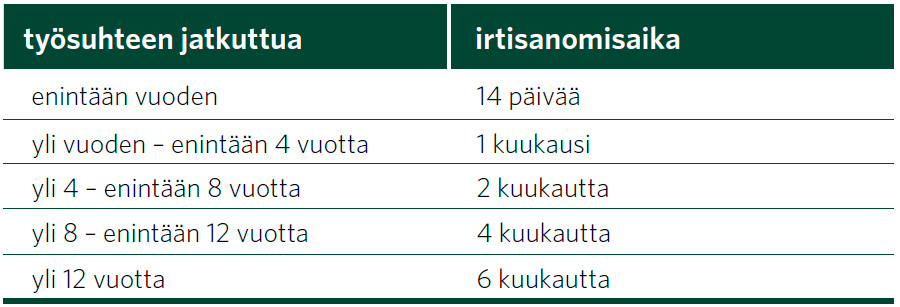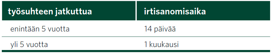 Etusivu » Työehtosopimukset » PAMin alojen työehtosopimukset » Kaupan logistiikan esihenkilöiden työehtosopimus » 4 § Irtisanomisaika ← Takaisin sisällysluetteloon 4 § Irtisanomisaika 1. Työnantajan noudattama irtisanomisaika on Kaupan työehtosopimuksen 5 §:n 1. kohdan mukaan: 2. Esihenkilön noudattama irtisanomisaika on Kaupan työehtosopimuksen 5 §:n 2. kohdan mukaan: 3. Molempien osapuolten irtisanomisajaksi voidaan 1. ja 2. kohdista poiketen sopia 2 kuukautta. Jos työnantajan irtisanomisaika on 1. kohdan mukaan pidempi kuin tämän kohdan nojalla sovittu 2 kuukauden irtisanomisaika, työnantajan on noudatettava pidempää irtisanomisaikaa. ← Takaisin sisällysluetteloon