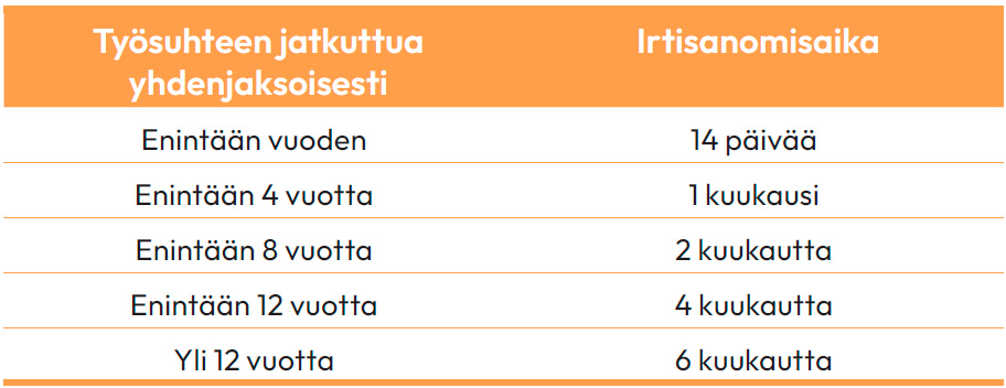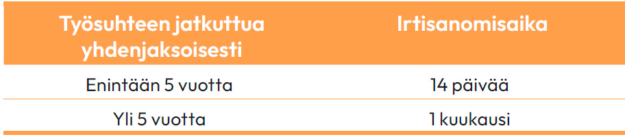 Etusivu » Työehtosopimukset » PAMin alojen työehtosopimukset » Kiinteistöpalvelualan työehtosopimus » II Työsuhde ← Takaisin sisällysluetteloon II Työsuhde Sisällysluettelo Open or close menu Takaisin sisällysluetteloon II Työsuhde 4 § Työnjohto5 § Järjestäytymisoikeus6 § Työsopimus ja koeaika7 § Työsuhteen päättyminen1. Irtisanomisaika2. Työntekijän kuuleminen päätettäessä työsuhdetta henkilöstä johtuvasta syystä3. Määräaikainen työsopimus4. Lomautusilmoitusaika5. YT-lain mukainen neuvotteluesitysaika6. Työntarjoamisvelvollisuuden alueellinen rajaaminen määräaikaisissa lomautuksissa 4 § Työnjohto Työnantaja johtaa ja jakaa työtä sekä ottaa ja erottaa työntekijät. 5 § Järjestäytymisoikeus Järjestäytymisoikeus on molemmin puolin loukkaamaton. Työnantaja selvittää uudelle työntekijälle alan järjestö- ja neuvottelusuhteet ja ilmoittaa ketkä toimivat työpaikan luottamusmiehenä ja työsuojeluvaltuutettuna sekä antaa työntekijälle heidän yhteystietonsa. 6 § Työsopimus ja koeaika Toisen osapuolen vaatiessa työsopimus on tehtävä kirjallisesti. Työntekijälle on annettava työsopimuslain 2:4 §:n mukainen kirjallinen selvitys työnteon keskeisistä ehdoista, jolleivat ne käy ilmi kirjallisesta työsopimuksesta. Työnantaja ja työntekijä voivat sopia koeajasta. Koeaika on enintään kuusi kuukautta, ellei työsopimuslaista muuta johdu. Määräaikaisessa työsuhteessa koeaika saa pidennyksineen olla korkeintaan puolet työsopimuksen kestosta, ei kuitenkaan enempää kuin kuusi kuukautta. Koeaikaa voidaan pidentää työkyvyttömyys- ja perhevapaatilanteissa työsopimuslain mukaisesti. 7 § Työsuhteen päättyminen Työsuhteen päättämiseen noudatetaan työsopimuslain säännöksiä. 1. Irtisanomisaika Työnantajan irtisanoessa irtisanomisaika on: Työntekijän irtisanoutuessa irtisanomisaika on: Irtisanomisaika alkaa kulua irtisanomista seuraavana päivänä. Kun irtisanomisaika lasketaan kuukausina, työsuhde päättyy järjestysnumeroltaan samana päivänä, kun irtisanominen on suoritettu. Jos vastaavaa päivää ei ole siinä kuussa, jossa määräaika päättyisi, työsuhde päättyy kuukauden viimeisenä päivänä. Esimerkkejä a) Irtisanomisaika 14 päivää Työsuhde on irtisanottu keskiviikkona. Irtisanomisaika alkaa kulua seuraavana päivänä eli torstaina. Työsuhteen viimeinen päivä on kahden viikon kuluttua keskiviikkona. b) Irtisanomisaika yksi kuukausi Työsuhde on irtisanottu 3.9. Irtisanomisaika alkaa kulua 4.9. Työsuhteen viimeinen päivä on 3.10. c) Irtisanomisaika 4 kuukautta Työsuhde on irtisanottu 31.10. Irtisanomisaika alkaa kulua 1.11. Työsuhteen viimeinen työpäivä on 28.2. 2. Työntekijän kuuleminen päätettäessä työsuhdetta henkilöstä johtuvasta syystä Työnantajan harkitessa työntekijän työsuhteen päättämistä henkilöstä johtuvasta syystä, työntekijälle on varattava tilaisuus tulla kuulluksi työsopimuksen päättämisen syistä. Kuulemistilaisuus on järjestettävä niin, että työntekijällä on kohtuullinen valmistautumisaika ennen kuulemista, ja että hänellä on riittävät tiedot päättämisharkinnan perusteena olevista seikoista ja tosiasiallinen mahdollisuus esittää oma kantansa asiassa. Työnantajan tulee tiedottaa työntekijää kuulemistilaisuuden tarkoituksesta sekä oikeudesta käyttää avustajaa kuulemistilaisuudessa. Työntekijän pyynnöstä avustajana voi toimia luottamusmies tai jos luottamusmiestä ei ole valittuna, avustajana voi työntekijän pyynnöstä toimia esimerkiksi ammattiliiton tai ammattiosaston edustaja. Kuulemistilaisuudessa työnantaja arvioi työsuhteen jatkamisedellytyksiä. 3. Määräaikainen työsopimus Päättäessään työsuhteen ennen määräaikaa, työntekijä maksaa työnantajalle sopimussakkona kahden viikon palkan tai laiminlyödyn kauden ollessa lyhyempi, sitä vastaavan määrän. 4. Lomautusilmoitusaika Työntekijä voidaan lomauttaa työsopimuslain mukaisesti. Paikallisesti sopien lomautusilmoitusaika voidaan lyhentää 7 päivään. 5. YT-lain mukainen neuvotteluesitysaika Työnantajan lomauttaessa työntekijöitä neuvotteluesityksen antamisaika 5 päivää sisältyy kokonaisneuvotteluaikaan. 6. Työntarjoamisvelvollisuuden alueellinen rajaaminen määräaikaisissa lomautuksissa Määräaikaisen lomauttamisen perusteet ovat muutoin työsopimuslain 5 luvun 2 §:n 1 momentin 2 kohdan mukaiset, mutta työnantajan työn tarjoamis- ja koulutusvelvollisuus koskee vain samalla työssäkäyntialueella tarjolla olevaa työtä ja koulutusta. Soveltamisohje: Tässä määräyksessä työssäkäyntialueella tarkoitetaan aluetta, joka sijaitsee enintään 80 kilometrin etäisyydellä yrityksessä määritellystä työntekijän kotitoimipisteestä. Poikkeus koskien Kainuun, Pohjois-Pohjanmaan ja Lapin maakuntaa: Mikäli työntekijän pääasiallinen työntekopaikka sijaitsee yli 80 kilometrin päässä kotitoimipisteestä, määritellään työssäkäyntialue pääasiallisesta työntekopaikasta. ← Takaisin sisällysluetteloon