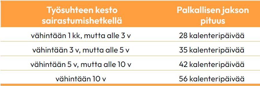 Etusivu » Työehtosopimukset » PAMin alojen työehtosopimukset » Kiinteistöpalvelualan työehtosopimus » V Poissaolot ← Takaisin sisällysluetteloon V Poissaolot Sisällysluettelo Open or close menu Takaisin sisällysluetteloon V Poissaolot 11 § Sairastuminen1. Ilmoitusvelvollisuus ja lääkärintodistukset2. Palkanmaksun edellytykset3. Sairausajan palkan maksaminen4. Sairausajan palkan määrä5. Sairauden uusiutuminen6. Sairauspoissaolo ilman lääkärintodistusta12 § Tilapäinen poissaolo1. Alle 10-vuotiaan lapsen äkillinen sairastuminen2. Muut tilapäiset poissaolot3. Vuosilomaedut13 § LääkärintarkastuksetPalkanmaksun edellytykset14 § PerhevapaatRaskausvapaan palkkaVanhempainvapaan palkka 11 § Sairastuminen1. Ilmoitusvelvollisuus ja lääkärintodistukset Työntekijän on viipymättä ilmoitettava työnantajalle työkyvyttömyydestään ja sen arvoidusta kestosta. Työntekijän on vaadittaessa esitettävä työkyvyttömyydestään lääkärintodistus tai muu työnantajan hyväksymä selvitys. Enintään kolme kalenteripäivää kestävän sairauspoissaolon osalta selvitys voidaan esittää myös työterveyshoitajan, terveydenhoitajan tai sairaanhoitajan antamalla todistuksella edellyttäen, että kysymyksessä on epidemialuontoinen sairaus (esim. flunssa tai vatsatauti) ja sairaanhoitoa ei ole järjestetty osana työnantajan kustantamaa työterveyshuoltoa ja työntekijä ei ole pyynnöstään huolimatta saanut vastaanottoaikaa julkisen terveydenhuollon piiriin kuuluvalta lääkäriltä hoidon kiireellisyysluokituksen tai muun pakottavan syyn vuoksi. Edellyttäessään työntekijän käyvän tietyn lääkärin vastaanotolla työnantaja korvaa lääkärintodistuksen hankkimiskustannukset. 2. Palkanmaksun edellytykset Työnantaja maksaa sairausajan palkkaa, jos työntekijän työsuhde on kestänyt vähintään kuukauden ja työntekijä on sairauden tai tapaturman vuoksi estynyt tekemästä työsopimuksensa mukaista työtä ja työntekijä ei ole aiheuttanut työkyvyttömyyttään tahallisesti, rikollisella toiminnallaan, kevytmielisellä elämällään tai muulla törkeällä huolimattomuudella. 3. Sairausajan palkan maksaminen Sairausajan palkka maksetaan toisen sellaisen sairauspäivän alusta, joka olisi ollut työntekijän työpäivä. Karenssipäivää ei kuitenkaan ole, kun työntekijän työsuhde on ennen sairauden alkamista jatkunut yhdenjaksoisesti vähintään kaksi vuotta tai kun työkyvyttömyys on aiheutunut työtapaturmasta tai kun työkyvyttömyys on jatkunut niin pitkään, että työntekijä alkaa saada sairausvakuutuslain mukaista päivärahaa. (Sairausvakuutuslain mukainen karenssiaika on 1 + 9 arkipäivää). Sairausajan palkka maksetaan työkyvyttömyysajalta seuraavasti: Palkka maksetaan jaksoon sisältyviltä työpäiviltä. Jos työkyvyttömyys alkaa kesken työpäivän tai -vuoron, työntekijälle maksetaan palkkaa työpäivän tai vuoron loppuun. Jos työntekijän työsuhde on kestänyt alle yhden kuukauden ja työntekijä on työtehtävissä tapahtuneen työtapaturman vuoksi estynyt tekemästä työsopimuksensa mukaista työtä, maksetaan sairausajan palkkaa heti työsuhteen alusta, mikäli työehtosopimuksen 11 §:n mukaiset edellytykset täyttyvät. Sairausajan palkkaa maksetaan tällöin kuitenkin enintään 28 kalenteripäivältä. 4. Sairausajan palkan määrä Kuukausipalkkaiselle työntekijälle maksetaan peruskuukausipalkkaa palkalliselta sairausjaksolta. Ilta-, yö- ja vuorotyölisät maksetaan sairausajan palkassa, jos niitä olisi kertynyt työntekijälle sairausjakson aikana. Palkallisen jakson alkaessa tai päättyessä kesken kuukauden noudatetaan palkanmaksussa osakuukauden palkan laskemista koskevaa määräystä (9.4 §). Tuntipalkkaiselle työntekijälle sairausajan palkka maksetaan keskituntiansion mukaan keskimääräisen vuorokautisen työajan mukaan. Keskimääräinen vuorokautinen työaika lasketaan samalta ajalta, jolta keskituntiansio on laskettu. Vähennykset Työnantajan maksamasta sairausajan palkasta vähennetään samasta työkyvyttömyydestä ja samalta ajanjaksolta saatu päiväraha tai siihen rinnastettava korvaus, joka maksetaan: lain perusteella, työnantajan kokonaan tai osaksi kustantaman muun vakuutuksen perusteella tai työnantajan kannatusmaksua saavasta sairausavustuskassasta. Jos päivärahaa ei työntekijästä itsestään johtuvista syistä makseta tai jos se maksetaan normaalia pienempänä, työnantajan palkanmaksuvelvollisuus vähenee maksamatta jääneellä määrällä. Jollei työntekijä ole lainkaan oikeutettu sairausvakuutuslain mukaiseen päivärahaan, työnantaja ei ole velvollinen maksamaan sairausajan palkkaa työehtosopimuksen mukaisesti. Palkan tultua jo maksetuksi työnantaja voi nostaa korvaukset itselleen tai periä ne työntekijältä, kuitenkin enintään maksamansa määrän. 5. Sairauden uusiutuminen Työntekijän sairastuessa samaan sairauteen 30 kalenteripäivän kuluessa työhön paluusta maksetaan sairausajan palkkaa seuraavasti: poissaolojaksot lasketaan yhteen ja niiltä maksetaan palkka kuin kyseessä olisi yksi sairastumisjakso palkan maksaminen alkaa heti ensimmäisestä sairastumispäivästä, joka olisi ollut työntekijän työpäivä. Karenssipäivää ei tässä tapauksessa ole. Saman sairauden uusiutuessa yli 30 kalenteripäivän kuluessa työhön paluusta sairausajan palkka maksetaan niin kuin kyseessä olisi uusi sairaus. 6. Sairauspoissaolo ilman lääkärintodistusta Sairauspoissaoloista aiheutuvien kustannusten vähentämiseksi voidaan paikallisesti sopia työehtosopimuksen 18 §:n mukaisesti jäljempänä tässä kohdassa mainitusta menettelystä. Menettely tarkoittaa työntekijän mahdollisuutta ilmoittaa lyhytaikaisesta työkyvyttömyydestään ja sen syystä työnantajalle ilman työkyvyttömyyden todentamaa lääkärin- tai terveydenhoitajan todistusta. Sopimus voi koskea enintään kolme kalenteripäivää kestäviä työntekijän omia sairauspoissaoloja 