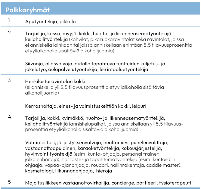 Etusivu » Työehtosopimukset » PAMin alojen työehtosopimukset » Matkailu-, ravintola- ja vapaa-ajan palveluita koskeva työntekijöiden työehtosopimus » 4. Palkka ← Takaisin sisällysluetteloon 4. Palkka Sisällysluettelo Open or close menu Takaisin sisällysluetteloon 4. Palkka 13 § Palkkausmuoto14 § Palkan määräytyminen1. Kokemusvuodet2. Harjoitteluaika3. Palkkaryhmät15 § Oppilas, nuori ja koululainen1. Oppisopimus2. Alle 18-vuotias työntekijä3. Koululainen16 § Palkkaa korottavat tekijät1. Luvanhaltijan edustajan lisä 2. Ilta- ja yötyölisä3. Liikenneaseman päivittäistavaramyymälälisä17 § Sunnuntai-, pyhä- ja aattotyö18 § Lisä- ja ylityö1. Lisätyö2. Ylityö3. Vajaan kolmiviikkoisjakson lisä- ja ylityö19 § Vapaapäivänä tehty työ20 § Korotetun palkan vaihtaminen vapaaseen21 § Palkan maksaminen1. Palkanmaksu 2. Osakuukauden palkka3. Palkanmaksu työsuhteen päättyessä4. Palkanpidätykset5. Palkan erittely6. Tilapäisen osa-aikaisen työn ajalta maksettava suhteutettu kuukausipalkka 13 § Palkkausmuoto Kokoaikatyöntekijälle maksetaan kuukausipalkkaa. Osa-aikatyöntekijälle maksetaan tuntipalkkaa. Tuntipalkka saadaan jakamalla kuukausipalkka luvulla 159. 14 § Palkan määräytyminen1. Kokemusvuodet Palkkataulukon vuosiporrasta määriteltäessä otetaan huomioon vastaavassa työtehtävässä työskennelty aika. Muussa työtehtävässä työskennelty aika otetaan huomioon kohtuullisessa määrin, jos työ osittain vastaa vaadittavaa ammattikokemusta. Työssäoloajan lisäksi huomioidaan vuosilomalain 7 §:n mukainen työssäoloon rinnastettava aika. Yhden kokemusvuoden saavuttaminen edellyttää: 1 vuoden työskentelyä, jos keskimääräinen vähimmäistyöaika on 60 tuntia kolmessa viikossa tai enemmän 2 vuoden työskentelyä, jos keskimääräinen vähimmäistyöaika on alle 60 tuntia kolmessa viikossa. Siirtyminen seuraavaan vuosiportaaseen toteutetaan vuosiportaan täyttymistä seuraavan palkanlaskentakauden alusta lukien. Mikäli työnantaja on tiedustellut työntekijän aiemmasta työkokemuksesta, eikä työntekijä ole esittänyt hyväksyttävää selvitystä aiemmasta työkokemuksestaan työsopimusta tehtäessä ja viimeistään ennen ensimmäistä palkanmaksua, myöhemmin esitettävä selvitys ei oikeuta aikaisemman työkokemuksen huomioon ottamiseen. 2. kohdan mukainen harjoitteluaika kerryttää myös kokemusaikaa. Työntekijän siirtyessä työsuhteensa aikana vaativamman palkkaryhmän mukaiseen uuteen työtehtävään tai esihenkilöiden työehtosopimuksen soveltamispiiriin määräytyy uusi taulukkopalkka sen vuosiportaan mukaan, joka on entistä taulukkopalkkaa lähinnä korkeampi. Esimerkki Aikaisemmin tarjoilijana kokoaikatyössä ajanjakson 1.1.2021 – 30.6.2025 työskennellyt työntekijä palkataan tarjoilijan tehtäviin 1.10.2025. Työntekijällä on työkokemusta yhteensä 4 vuotta 6 kuukautta. Työntekijän vähimmäispalkka määräytyy yli 2 v. palkkataulukon mukaisesti. Työntekijä siirtyy yli 5 v. palkkataulukkoon 1.4.2026. 2. Harjoitteluaika Työsuhteen alussa on harjoitteluaika. Harjoitteluaika on kuusi kuukautta. Mikäli työntekijällä on tehtävän edellyttämä ammatillinen koulutus, harjoitteluaika on kaksi kuukautta. Harjoitteluaikaa vähentää 1. kohdan mukaisesti määritelty työkokemus. Harjoittelijan palkka on 80 % kyseisen työtehtävän mukaisesta, 0–2 vuoden palkkataulukosta. Harjoitteluaika lasketaan samalla tavalla kuin kokemusaika (1. kohta), kuitenkin niin, että poissaoloajalta vain palkallinen poissaoloaika kerryttää harjoitteluaikaa. 3. Palkkaryhmät Työntekijälle maksetaan palkkaa sen palkkaryhmän mukaan, mitä hän tekee suurimman osan työajastaan. Jos työntekijä suorittaa säännöllisesti palkkaryhmäänsä vähemmän vaativaa työtä, tämä ei alenna hänen palkkaansa. Työntekijän tehdessä alle puolet työajastaan vaativamman palkkaryhmän töitä, työnantajan ja työntekijän on sovittava palkkaa korottavasta suhteellisesta osuudesta. Esimerkki Keittiöapulainen työskentelee noin 30 % työajastaan kokin tehtävissä. Ravintolassa anniskellaan yli 5,5 –tilavuusprosenttisia alkoholijuomia. Apulaisen taulukkopalkan korottamisesta on sovittava seuraavasti: Kokin taulukkopalkka 1.9.2025 (0-2 v.) 2118 € Keittiöapulaisen taulukkopalkka 1849 € Palkkojen ero 269 € Palkkojen ero 269 € Keittiöapulaisen palkkaa korotetaan: 269 € × 30 % = 80,70 € Palkka vähintään 1849 € + 80,70 € = 1929,70 € 15 § Oppilas, nuori ja koululainen1. Oppisopimus Oppisopimussuhteessa olevalle oppilaalle maksetaan 1. vuonna 80 % ja 2. vuonna 90 % asianomaisen ammattityöntekijän palkkaryhmän palkasta TES 14 § mukainen kokemusaika huomioiden. Kahden vuoden jälkeen oppisopimusoppilaalle maksetaan täyttä taulukkopalkkaa. Harjoittelijan ja oppilaan työn järjestämisessä on otettava huomioon harjoittelun tavoitteet sekä työsuojelulliset näkökohdat. 2. Alle 18-vuotias työntekijä Alle 18-vuotiaalle maksetaan 80 % asianomaisen palkkaryhmän palkasta, mikäli hänellä ei ole alan ammattitaitoa tai pätevyyttä. 3. Koululainen Peruskoulun ja lukion oppilaalle voidaan maksaa koululaisen palkkaa enintään kahdelta kuukaudelta. Koululaisen palkka on 70 % asianomaisen palkkaryhmän palkasta. 16 § Palkkaa korottavat tekijät1. Luvanhaltijan edustajan lisä Työnantajan määräämälle, alkoholilain mukaisena luvanhaltijan edustajana toimivalle työntekijälle maksetaan yli 5,5 tilavuusprosenttia etyylialkoholia sisältäviä alkoholijuomia anniskelevassa anniskelupaikassa: vähintään hovimestarin taulukkopalkan mukainen tuntipalkka työvuorokohtaisesti niiltä tunneilta, joille nimeäminen luvanhaltijan edustajaksi on tapahtunut tai kiinteää erillistä korvausta ottamalla huomioon vastuuvuorojen suhteellinen osuus. Lisäksi edellytyksenä on, että työntekijä toimii työnantajan nimeämänä anniskelusta vastaavana henkilönä. Vastuuvuorot pyritään etukäteen merki