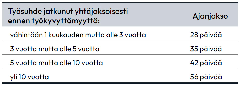 Etusivu » Työehtosopimukset » PAMin alojen työehtosopimukset » Vartiointialan työehtosopimus » 41 § Sairausajan palkka ← Takaisin sisällysluetteloon 41 § Sairausajan palkka Sisällysluettelo Open or close menu Takaisin sisällysluetteloon 41 § Sairausajan palkka MaksuperusteTyötapaturmaHyväksyttävä selvitysIlmoitus lyhytkestoisesta sairauspoissaolostaKorvaava työPalkan epääminenTyönantajan vastuuVähennyksetIlmoittaminenTyövoimareservi Maksuperuste Työnantaja maksaa työntekijälle palkkaa sairaudesta tai tapaturmasta johtuvasta työkyvyttömyydestä, josta on esitetty työnantajan hyväksymä selvitys. Palkkaa maksetaan jäljempänä mainitun ajanjakson työpäiviltä: Alle 2 vuoden työsuhteissa on yksi karenssipäivä. Jos oikeus sairausvakuutuspäivärahaan on alkanut tai jos työkyvyttömyys johtuu työtapaturmasta, palkka maksetaan myös karenssipäivältä. Jos työntekijän työsuhde on kestänyt alle yhden kuukauden ja työntekijä on työtehtävissä tapahtuneen työtapaturman vuoksi estynyt tekemästä työsopimuksensa mukaista työtä, maksetaan sairausajan palkkaa heti työsuhteen alusta, mikäli työehtosopimuksen 41 §:n mukaiset edellytykset täyttyvät. Sairausajan palkkaa maksetaan tällöin kuitenkin enintään 28 päivän ajanjaksolta. Jos työkyvyttömyys alkaa kesken työvuoron, maksetaan palkkaa työvuoron loppuun. Sairausajan palkka maksetaan KTA:lla. Työtapaturma Jos työntekijä on tullut työtehtäviensä johdosta häntä kohdanneen väkivallan vuoksi kykenemättömäksi suorittamaan työtään, hänelle maksetaan työkyvyttömyyden aiheuttaman yhdenjaksoisen sairauspoissaolon ajalta palkkaa 3 kuukaudelta työsuhteen kestosta riippumatta. Hyväksyttävä selvitys Työkyvyttömyys todetaan ensisijaisesti lääkärintodistuksella. Enintään kolme kalenteripäivää kestävän sairauspoissaolon osalta selvitys voidaan perustellusta syystä esittää työterveyshoitajan, terveydenhoitajan tai sairaanhoitajan antamalla todistuksella. Todistus työkyvyttömyydestä on esitettävä viipymättä. Työnantajalla ei ole oikeutta pidättäytyä palkanmaksusta, ellei työntekijälle ole ilmoitettu selvityksen riittämättömyydestä kolmen arkipäivän kuluessa selvityksen esittämisestä. Ilmoitus lyhytkestoisesta sairauspoissaolosta Osana sairauspoissaolojen seurantaa ja hallintaa yrityksessä voi olla käytössä oma ilmoitus -menettely. Oma ilmoitus -menettely tarkoittaa työntekijän mahdollisuutta ilmoittaa omasta työkyvyttömyydestään työnantajalle ilman työkyvyttömyyden todentavaa lääkärin- tai terveydenhoitajan todistusta. Menettely koskee enintään kolme vuorokautta kestäviä työntekijän omia poissaoloja. Työkyvyttömyydestä tulee ilmoittaa työnantajalle viipymättä. Jos työnantajalla on perusteltu syy epäillä työntekijän työkyvyttömyyttä, työnantaja voi aina pyytää työntekijää toimittamaan poissaolo-oikeuden ja palkanmaksuvelvollisuuden edellytyksenä lääkärinlausunnon työterveyslääkäriltä tai muulta nimeämältään lääkäriltä. Korvaava työ Työntekijöille voidaan osoittaa korvaavaa työtä, joka ei haittaa työntekijän tervehtymistä. Korvaava työ edellyttää työntekijän suostumusta. Työntekijällä on oikeus keskeyttää korvaava työ. Korvaavan työn muista ehdoista sovitaan paikallisesti työntekijän kanssa (51 §). Palkan epääminen Palkkaa ei makseta, jos työntekijä on aiheuttanut työkyvyttömyyden tahallisesti tai törkeällä huolimattomuudella. Palkkaa ei myöskään makseta, jos päivärahaa ei työntekijästä itsestään johtuvista syistä makseta. Jos päiväraha maksetaan normaalia pienempänä, työnantajan palkanmaksuvelvollisuus vähenee maksamatta jääneellä määrällä. Työnantajan on ennen palkan epäämistä annettava työntekijälle mahdollisuus korjata laiminlyöntinsä. Sairausajan palkan maksaminen edellyttää, että työntekijä esittää viipymättä sitä koskevan sairauslomatodistuksen. Työnantajan vastuu Jos työntekijälle ei makseta päivärahaa työnantajasta johtuvasta syystä, on työntekijällä oikeus saada palkkaa siltä ajalta, jolta etuus olisi pitänyt maksaa. Maksettuun palkkaan sovelletaan mitä tässä pykälässä on säädetty vähennyksistä. Työntekijän on ennen palkanmaksuvaatimusta annettava työnantajalle mahdollisuus korjata laiminlyöntinsä. Vähennykset Työnantaja on oikeutettu nostamaan, perimään takaisin tai vähentämään sairausajan palkasta työntekijän samasta työkyvyttömyydestä samalta ajanjaksolta saaman päivärahan tai vastaavan työn-antajan kannattamalta sairausvakuutuskassalta, tai tapaturmavakuutuslain, työntekijäin eläkelain tai liikennevakuutuslain perusteella työntekijän saaman korvauksen, kuitenkin enintään maksamansa määrän. Ilmoittaminen Sairastumisesta on viipymättä ilmoitettava työnantajalle. Työvoimareservi Sairausajan palkanmaksu edellyttää työvuorolistaan merkittyjä työvuoroja. Soveltamisohje Jos työntekijän työkyvyttömyys saman sairauden johdosta alkaa uudelleen 30 päivän kuluessa siitä päivästä, jolta hänelle viimeksi maksettiin sairausajan palkkaa, ei työntekijä ole oikeutettu uuteen sairausajan palkan jaksoon, vaan sairausajan palkkaa maksetaan yhteensä enintään edellä mainitulta ajanjaksolta (Kelan tulkinta). ← Takaisin sisällysluetteloon