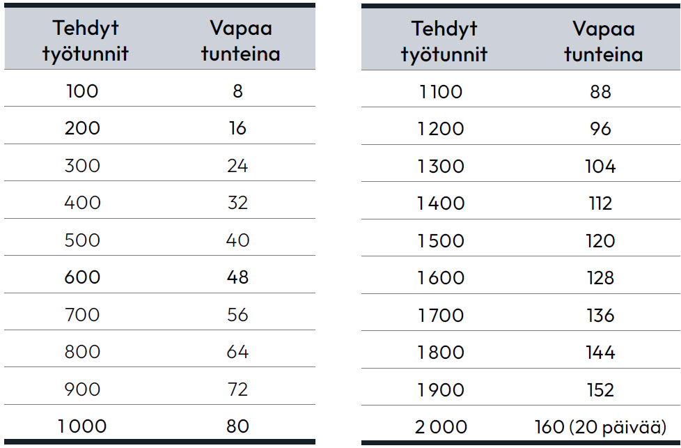 Etusivu » Työehtosopimukset » PAMin alojen työehtosopimukset » Vartiointialan työehtosopimus » Liite 1 a Vuosivapaajärjestelmä ← Takaisin sisällysluetteloon Liite 1 a Vuosivapaajärjestelmä Sisällysluettelo Open or close menu Takaisin sisällysluetteloon Liite 1 a Vuosivapaajärjestelmä Vuosivapaajärjestelmä Paikallisesti pääluottamusmiehen kanssa sopien (51 §) voidaan ottaa käyttöön joustavan työajan malli ja/tai vuosivapaajärjestelmä seuraavassa esitetyllä tavalla. Paikallinen sopimus on toimitettava tiedoksi Palvelualojen ammattiliitto PAM ry:lle ja Palvelualojen työnantajat PALTA ry:lle. Työehtosopimusosapuolet arvioivat keskenään paikallisesti sovittujen mallien toimivuutta ja työehtosopimusmääräysten kehitystarpeita saatujen kokemusten perusteella. Vuosivapaajärjestelmä Vuosivapaajärjestelmä korvaa kuukausipalkkaisten työntekijöiden työehtosopimuksen työajanlyhennysvapaata ja arkipyhävapaata koskevat määräykset. Palkallista vapaata kertyy kalenterivuoden aikana työssäolon ja siihen verrattavalta ajalta seuraavasti: Työssäoloon verrattavalla ajalla tarkoitetaan karenssipäivää sekä työstä poissaoloaikaa, jolta työnantaja on lain tai tämän työehtosopimuksen mukaan velvollinen maksamaan palkan. Työssäolopäivien veroisina pidetään myös niitä työpäiviä tai työtunteja, jolloin työntekijä työsuhteen kestäessä on estynyt tekemästä työtä vuosilomalain 7 §:n 2 momentin, tai tämän työehtosopimuksen 46 §:n mukaan. Samoin rinnastetaan säännöllisiin työtunteihin työnantajan osittainkin kustantama koulutusaika siltä osin kuin työnantaja korvaa ansionmenetyksen. Työsuhteen alkaessa ensimmäisen kolmen kuukauden ajalta vapaata kerryttäväksi ajaksi lasketaan puolet tehdystä työajasta tai siihen rinnastettavasta ajasta. Perusteeton palkaton poissaolo (työvuoro) vähentää oikeutta vapaaseen 8 tunnilla. Muun palkattoman poissaolon vaikutus vapaaseen sovitaan paikallisesti (51 §). Täysimääräisen vapaan saamisen edellytyksenä on, että työntekijällä on enintään 30 päivän pituinen vuosiloma ja että työntekijän vuotuista työaikaa lyhentää muutoin vain vuosivapaajärjestelmän mukaiset vapaat. Lomarahan vaihtaminen vastaavaan vapaaseen ei vaikuta vapaan määrään. Vapaan antamisen osalta noudatetaan työehtosopimuksen 19 §:n (työajan lyhentäminen) määräyksiä, mikäli paikallisesti ei sovita toisin (51 §) tai vapaata sovita siirrettäväksi työaikapankkiin. Korvaus vapaalta maksetaan KTA:lla. Vapaa rinnastetaan työssäoloon vuosiloman ansainnassa. Paikallisen sopimuksen irtisanomisessa noudatetaan työehtosopimuksen 51 §:n määräyksiä. ← Takaisin sisällysluetteloon