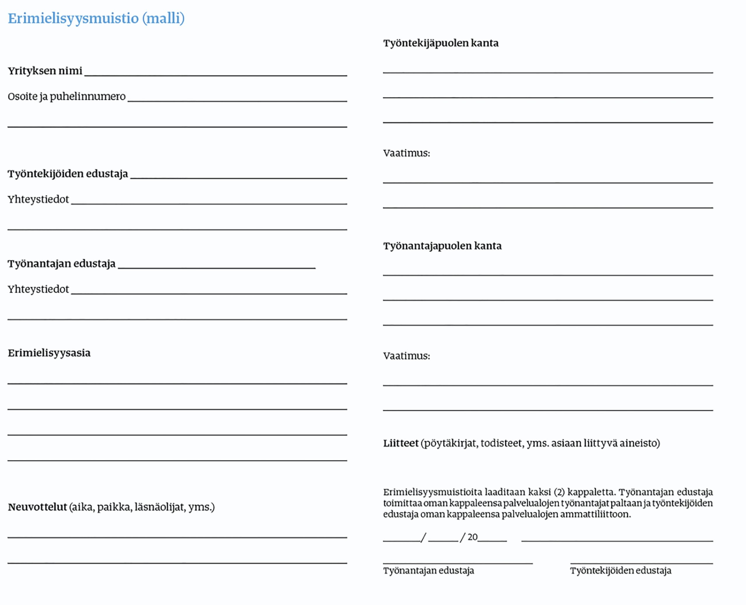 Etusivu » Työehtosopimukset » PAMin alojen työehtosopimukset » Vartiointialan työehtosopimus » Liite 9 Erimielisyysmuistio (malli) ← Takaisin sisällysluetteloon Liite 9 Erimielisyysmuistio (malli) ← Takaisin sisällysluetteloon